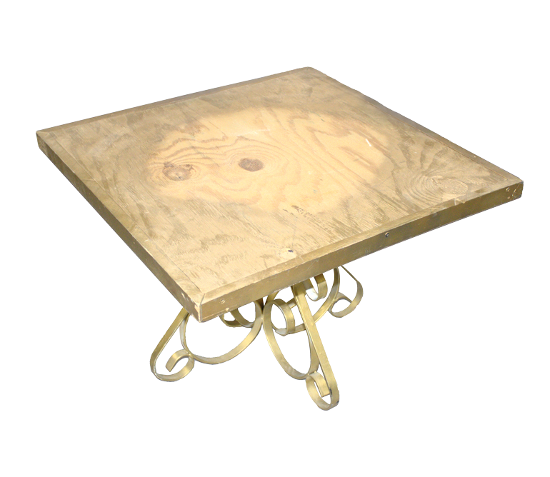 Gold, end table with square, wood top and metal, curly legs.