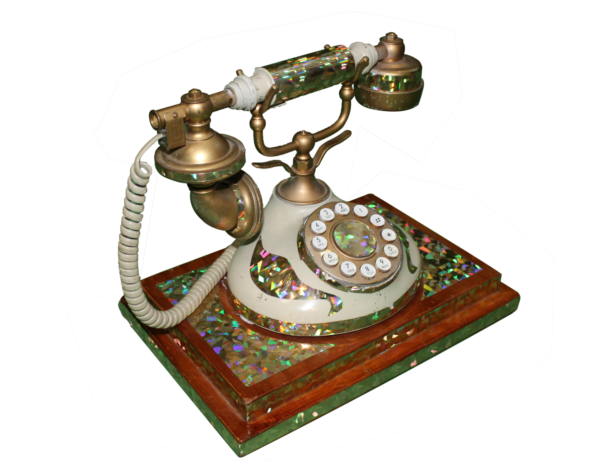 Beige desk telephone with circle base, push button dial in rotary style, gold holographic accents and wooden platform.