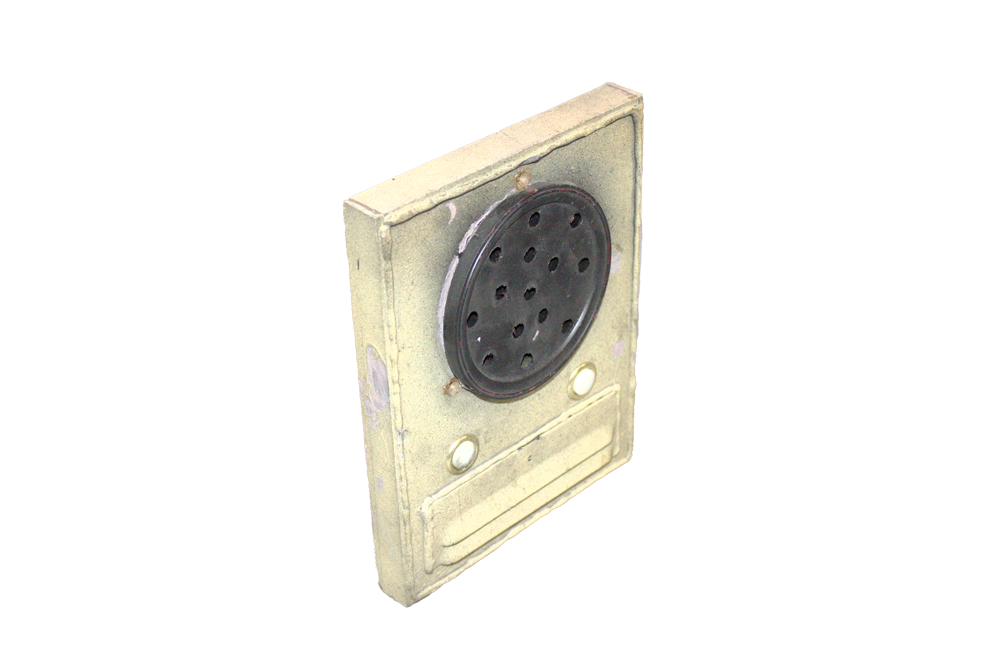 Beige, wooden, rectangular, faux wall mount intercom with black faux speaker and white buttons.