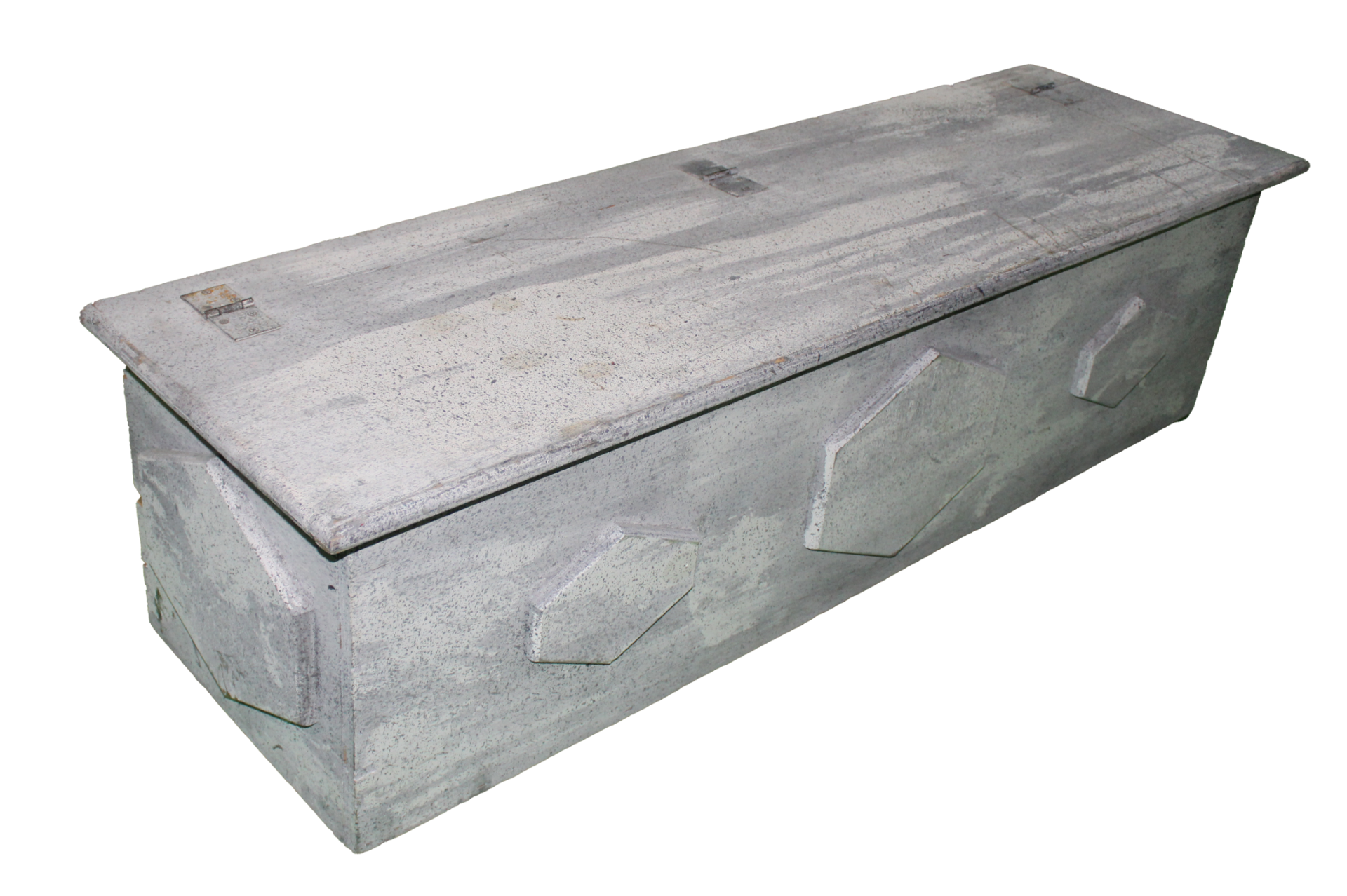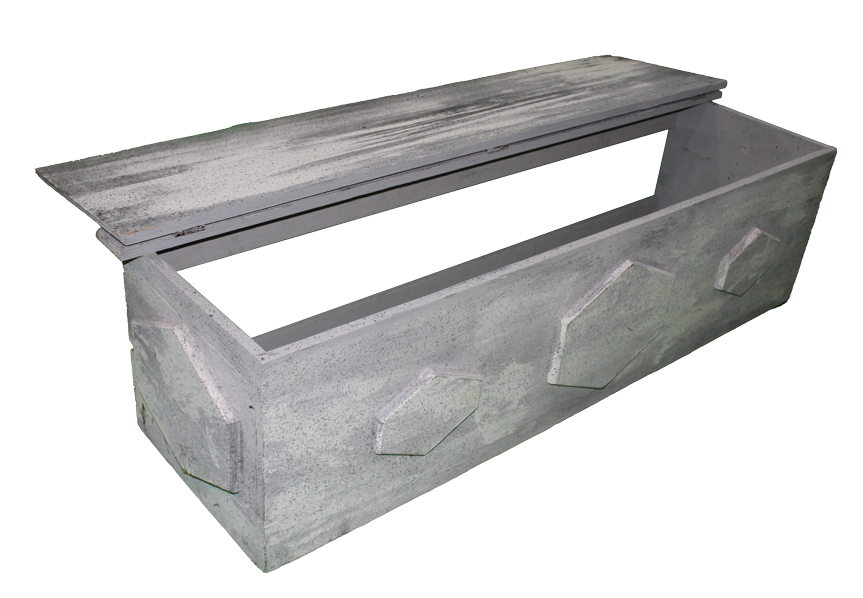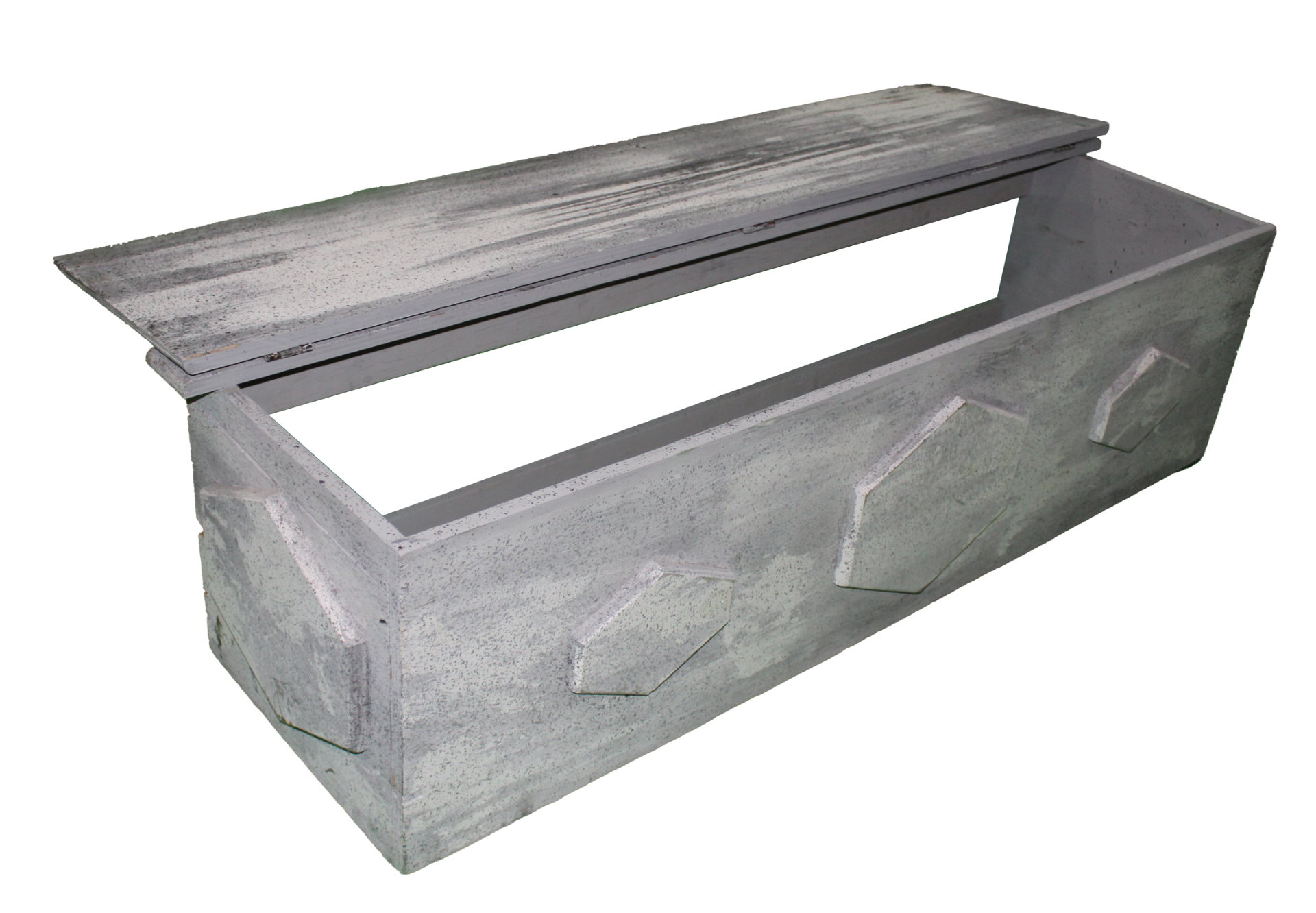 Light grey/white, faux stone, painted wood bench with hinged lid and hexagons.