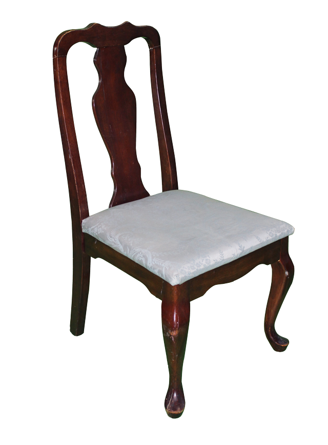 Dark brown, wooden, fiddleback chair with light blue, damask seat cushion.