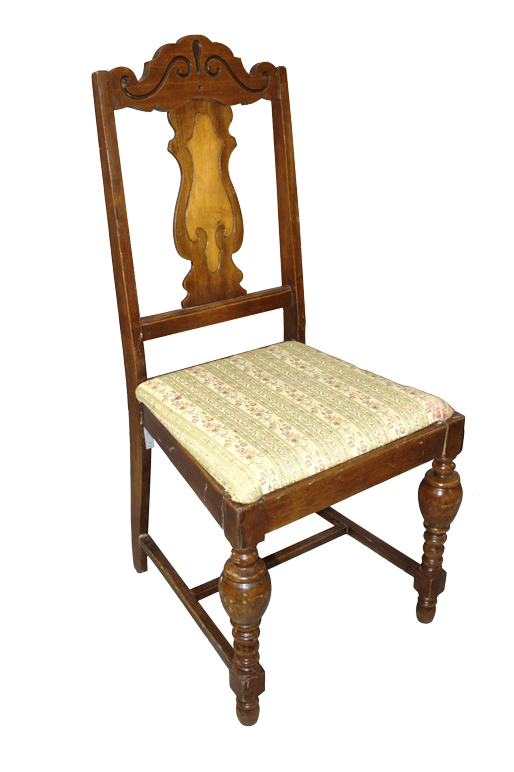 Dark brown, wooden side chair with pressed fiddle back and top, turned legs, and pale green/white, floral fabric seat cushion.