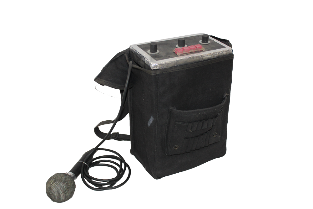 Black, wooden, faux field audio receiver with chrome trim, wired faux dynamic microphone attached and black carrying bag.