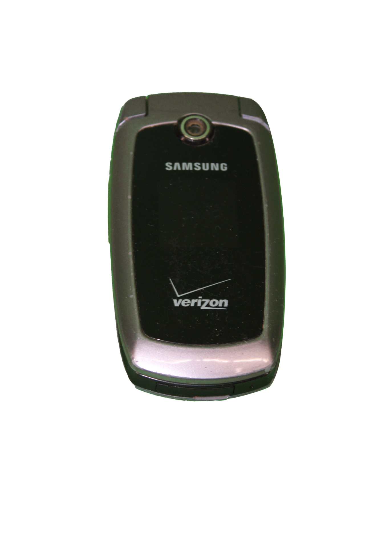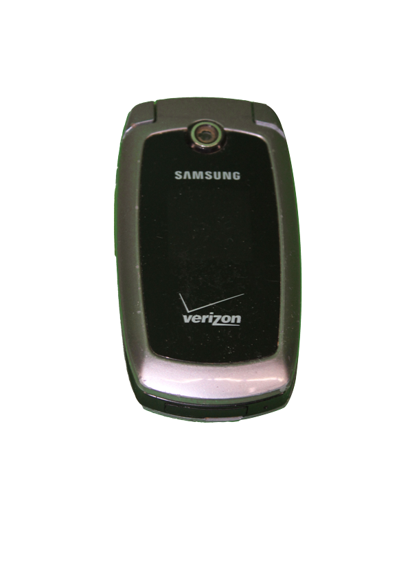 Silver/black Samsung Verizon SCh-U410 flip cell phone with black holster.