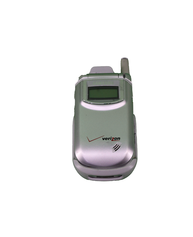 Silver Samsung Verizon flip cell phone with light grey holster.