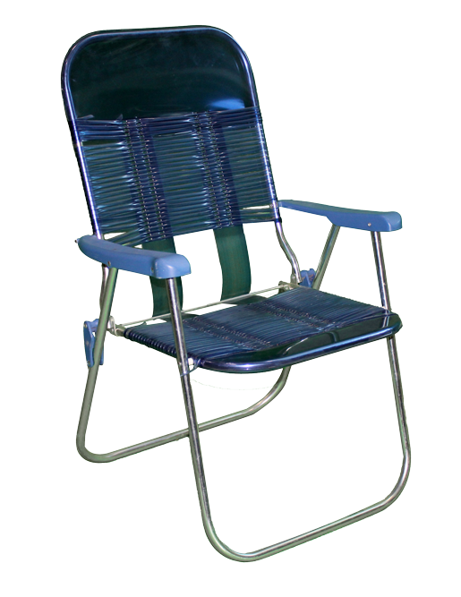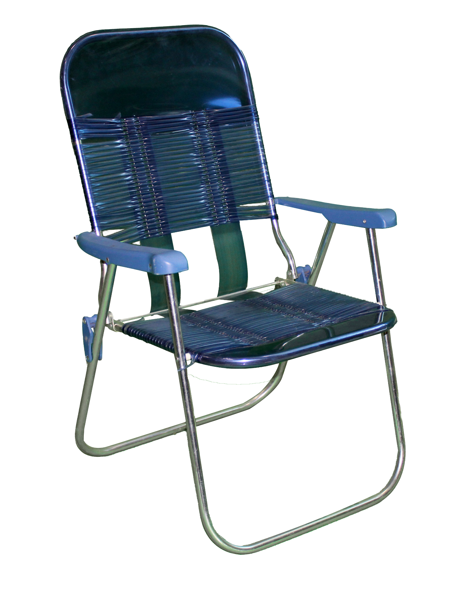 Navy, folding jelly chair with metal frame and plastic arms.