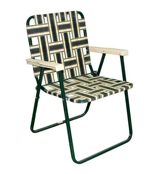 Forest green, metal folding chair with green/red/white, plaid, stretched nylon webbing and plastic arms.
