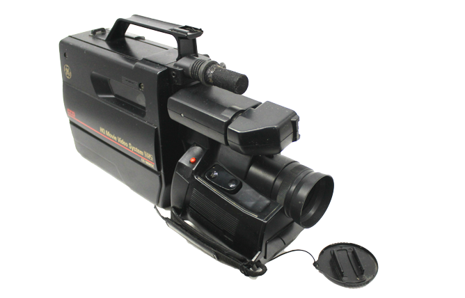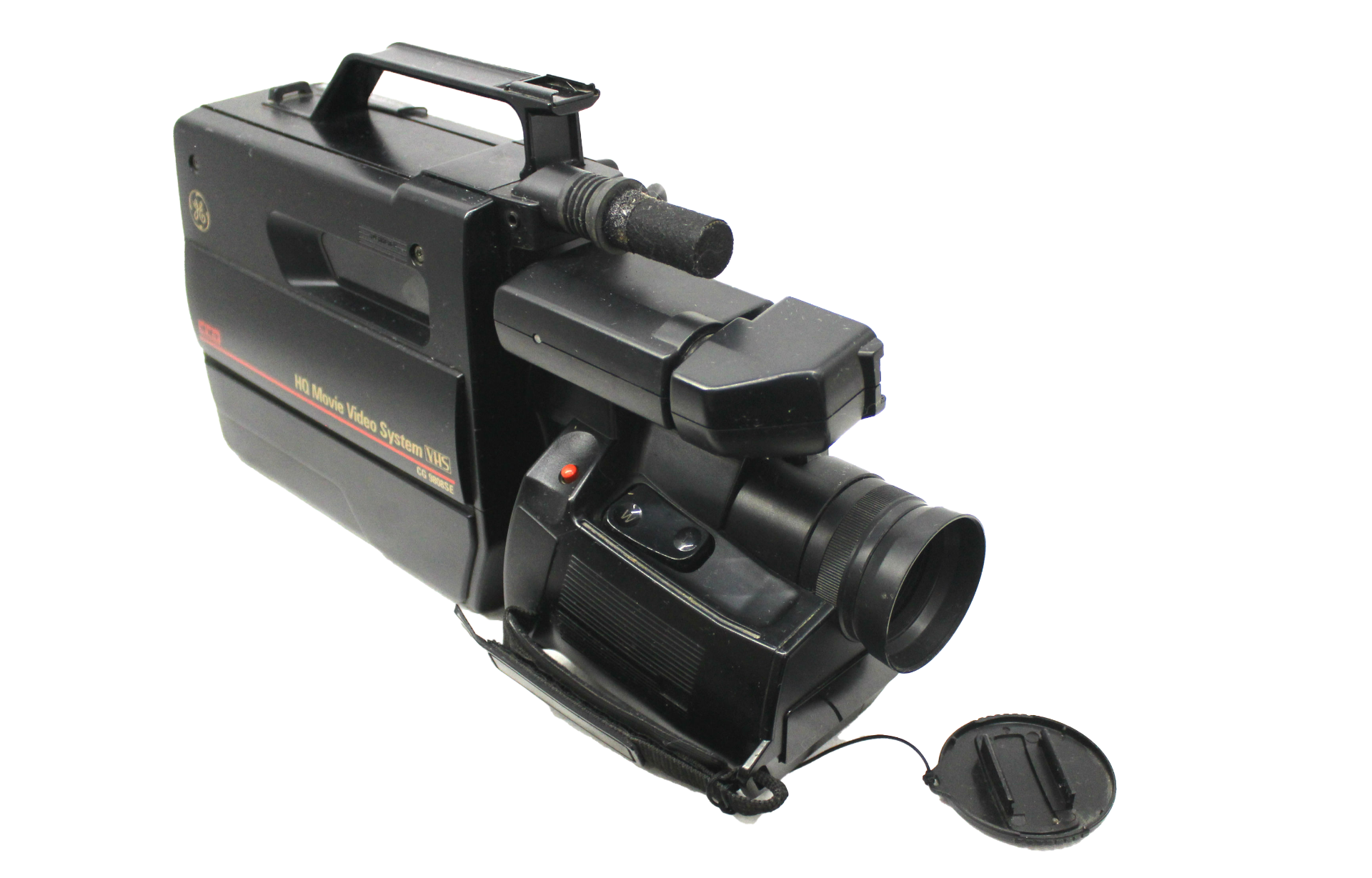 Black GE CG 9808SE VHS camcorder with grip belt and lens cap.