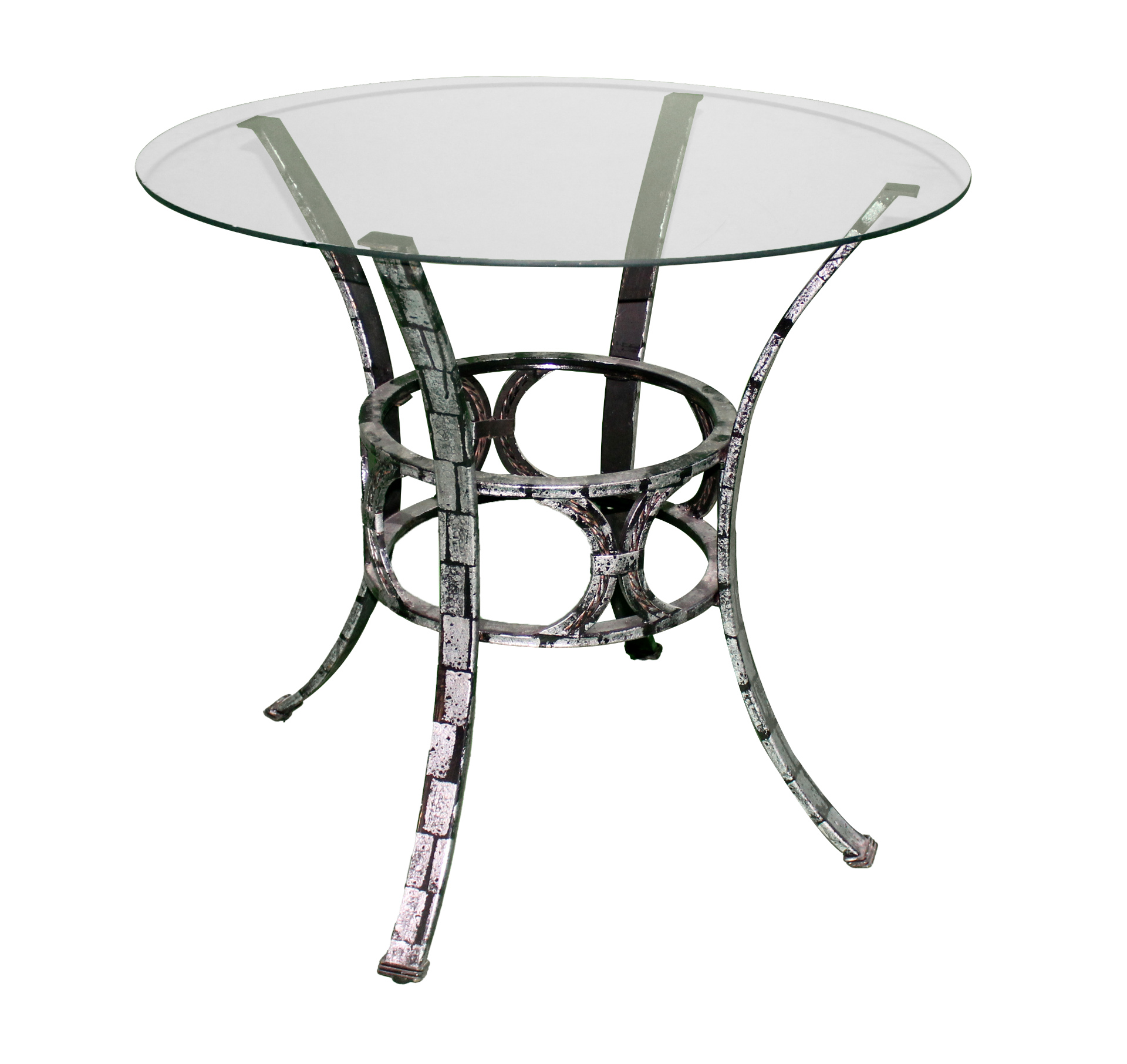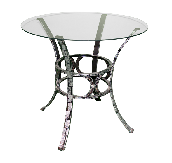 Silver/black, metal table with painted stone effect and glass circular top.