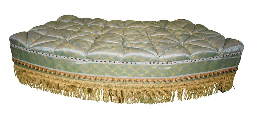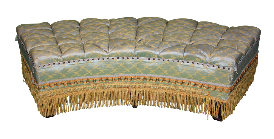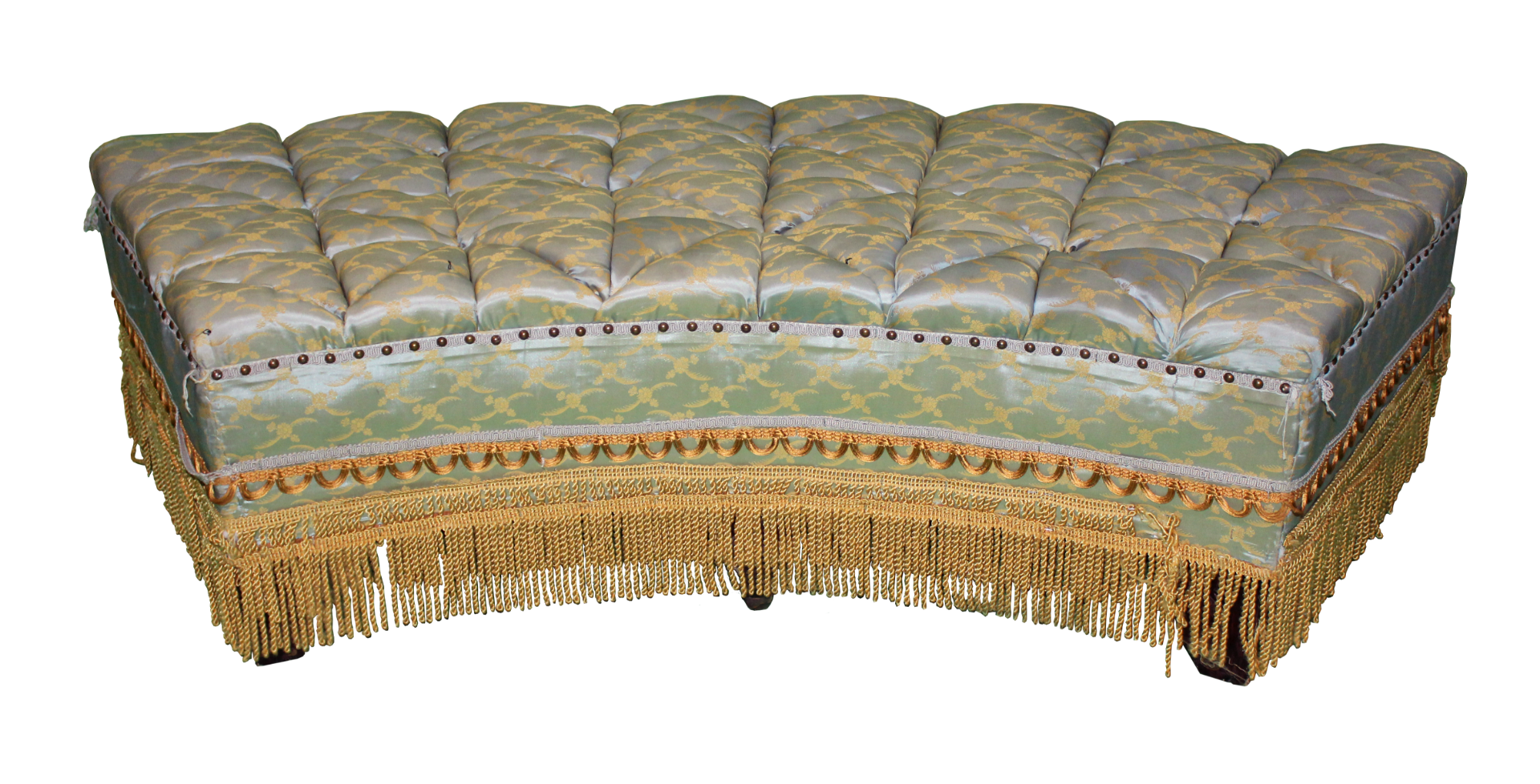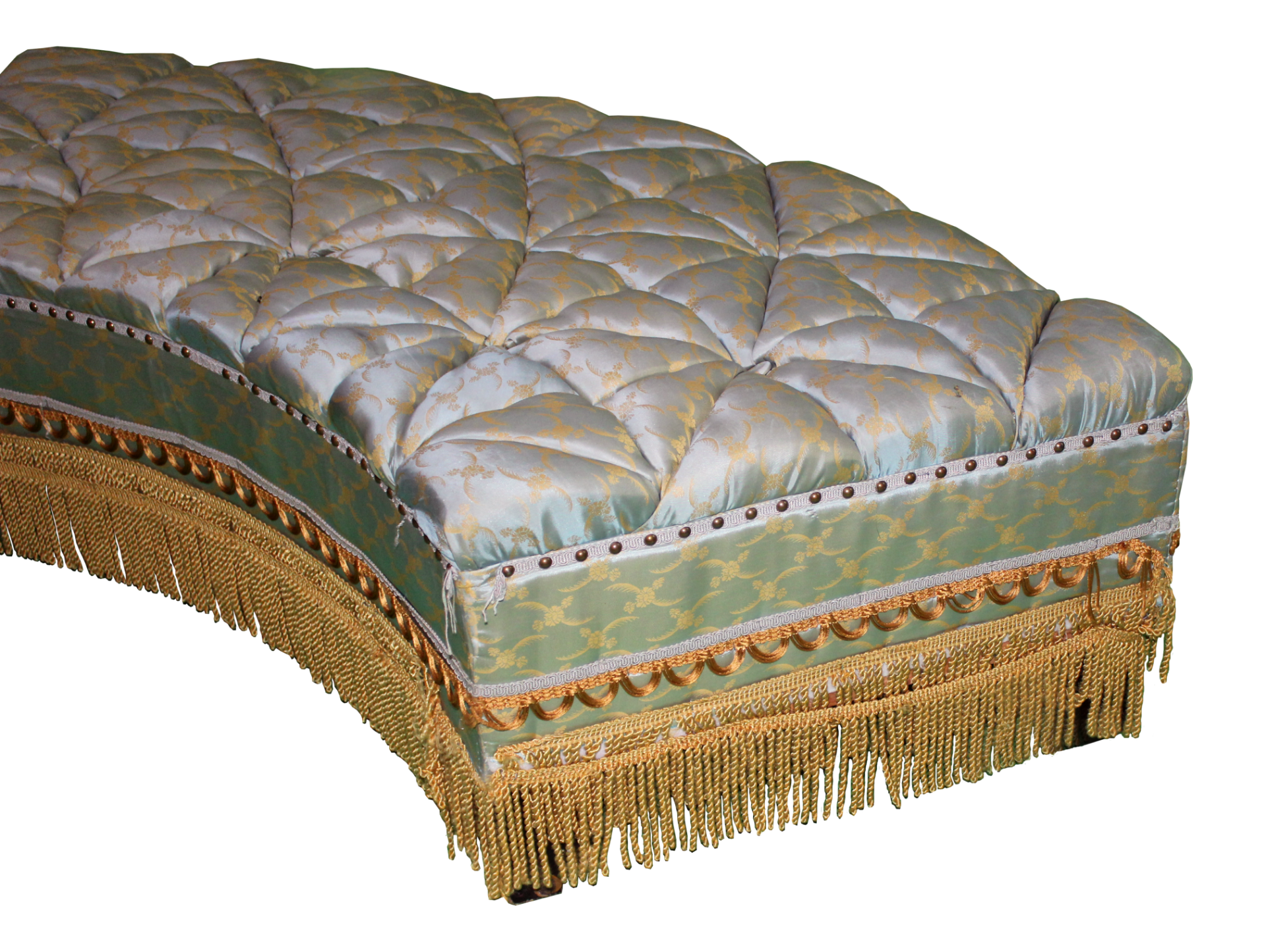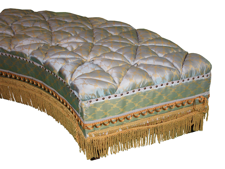 Aquamarine/gold, tufted, curved bench with gold fringe and nailhead trim.