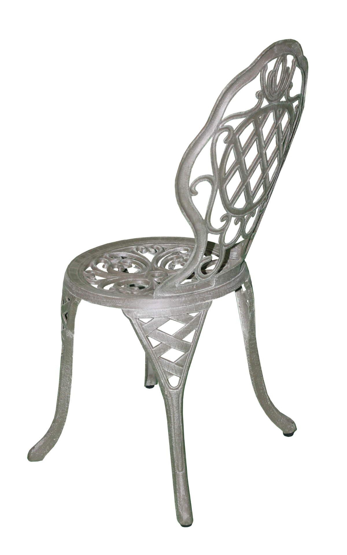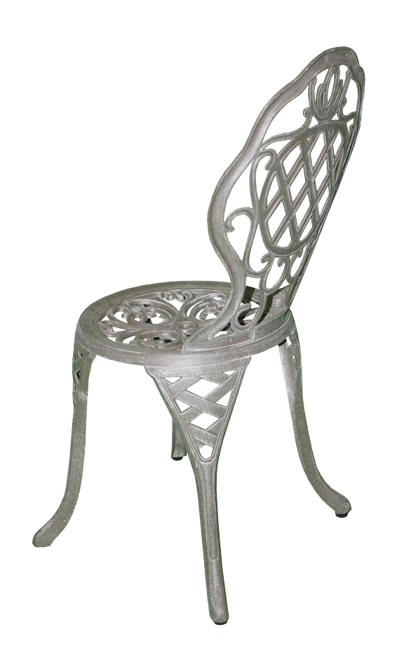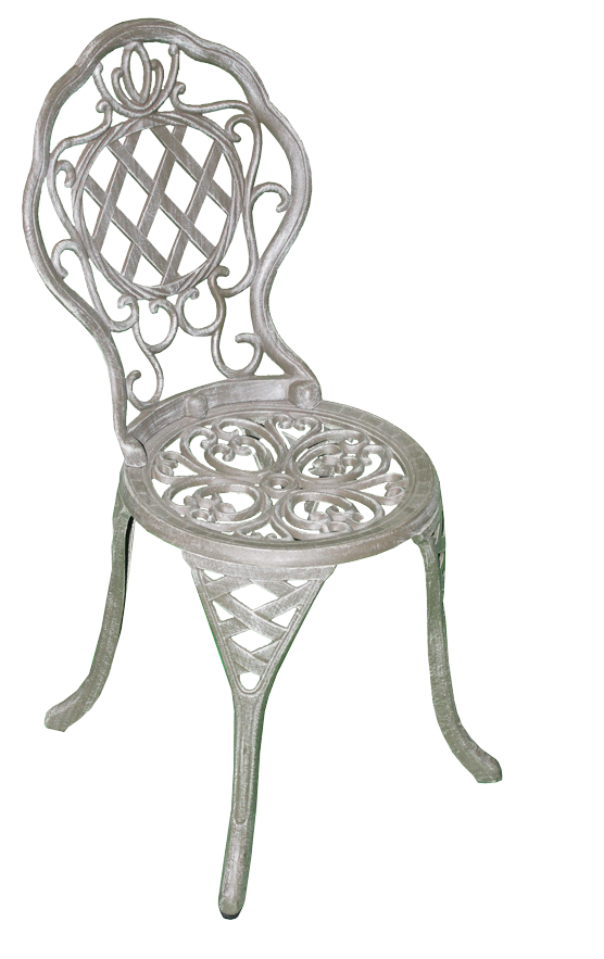 Grey, metal patio chair with scrollwork and cross weave design.