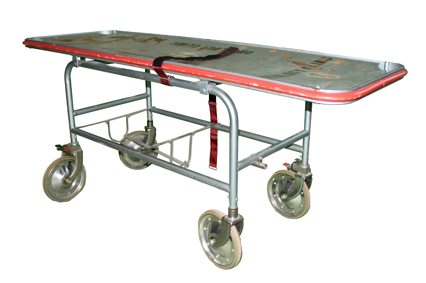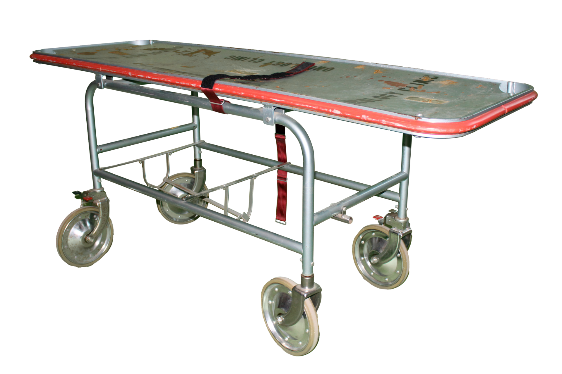 Silver, metal, distressed, rolling medical gurney with orange trim, burgundy center strap and "Oncology Clinic" stenciled in black on the top.