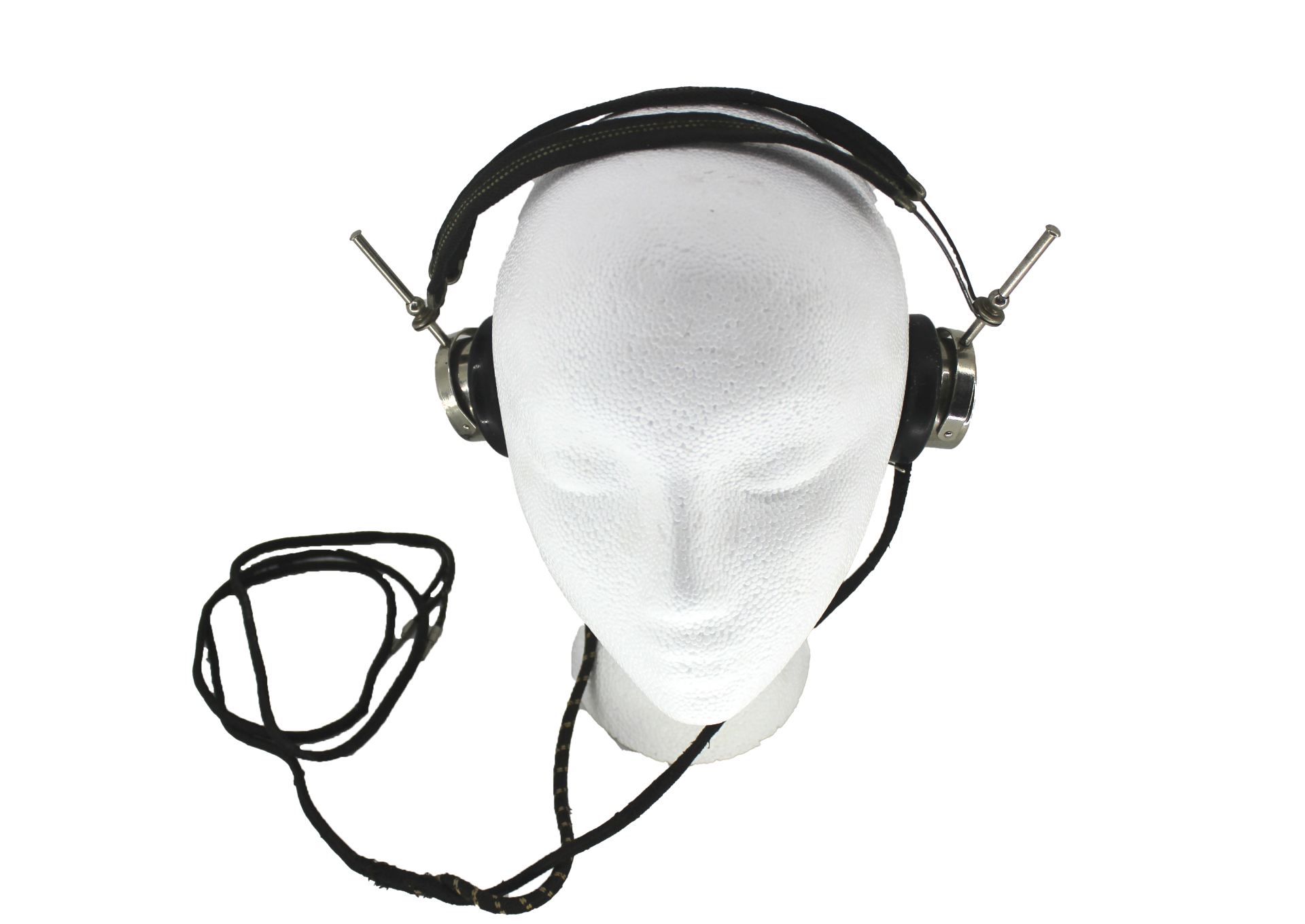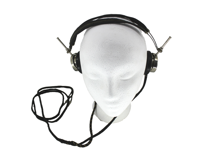 Black and chrome, metal Featherweight Twin-Tone over-ear headphones with attached faux wires.