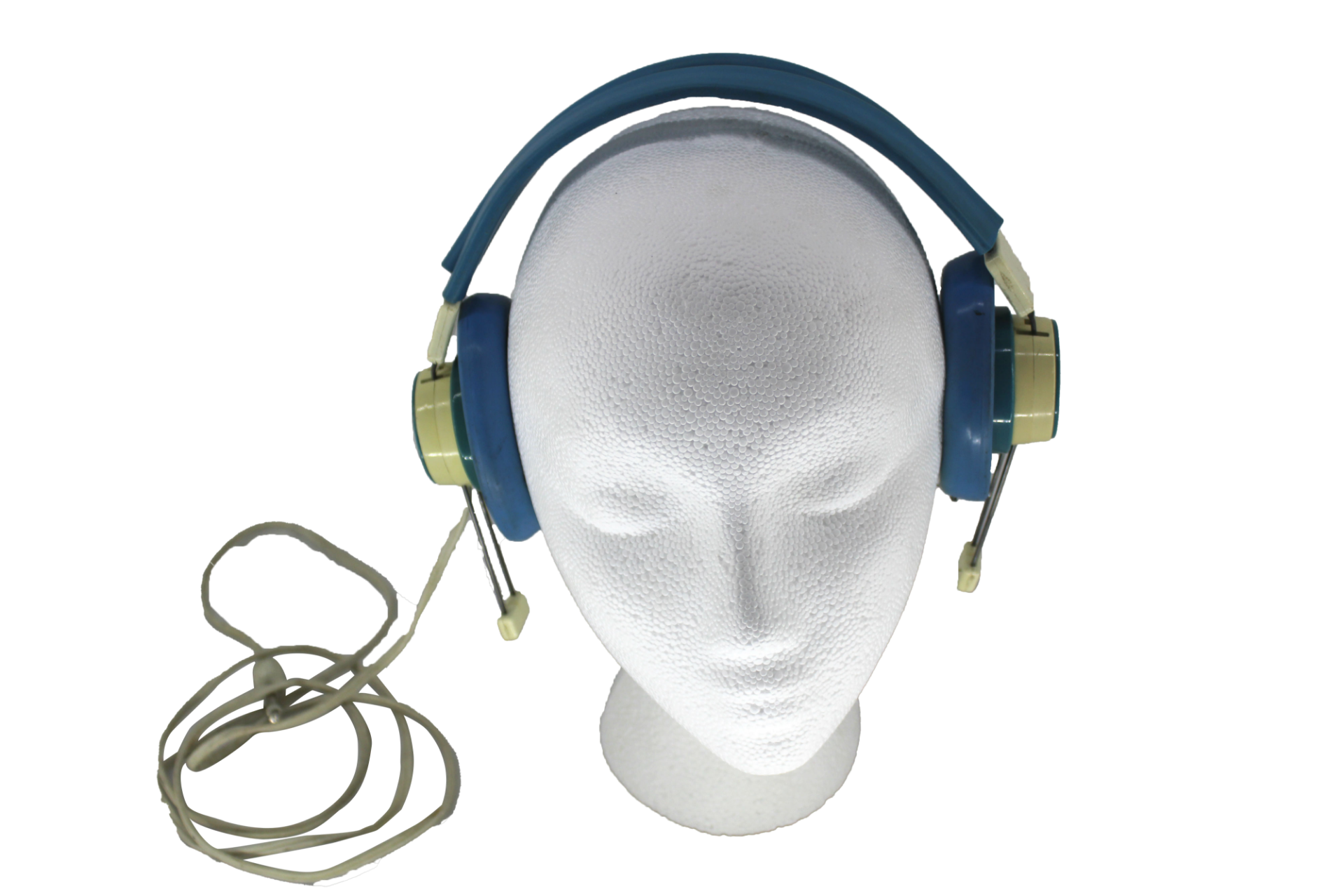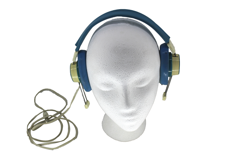 Blue and white, wire frame, Telex 601-1 over-ear headphones with attached 1/4" TRS cable.
