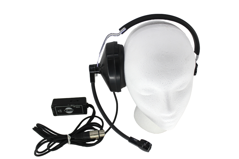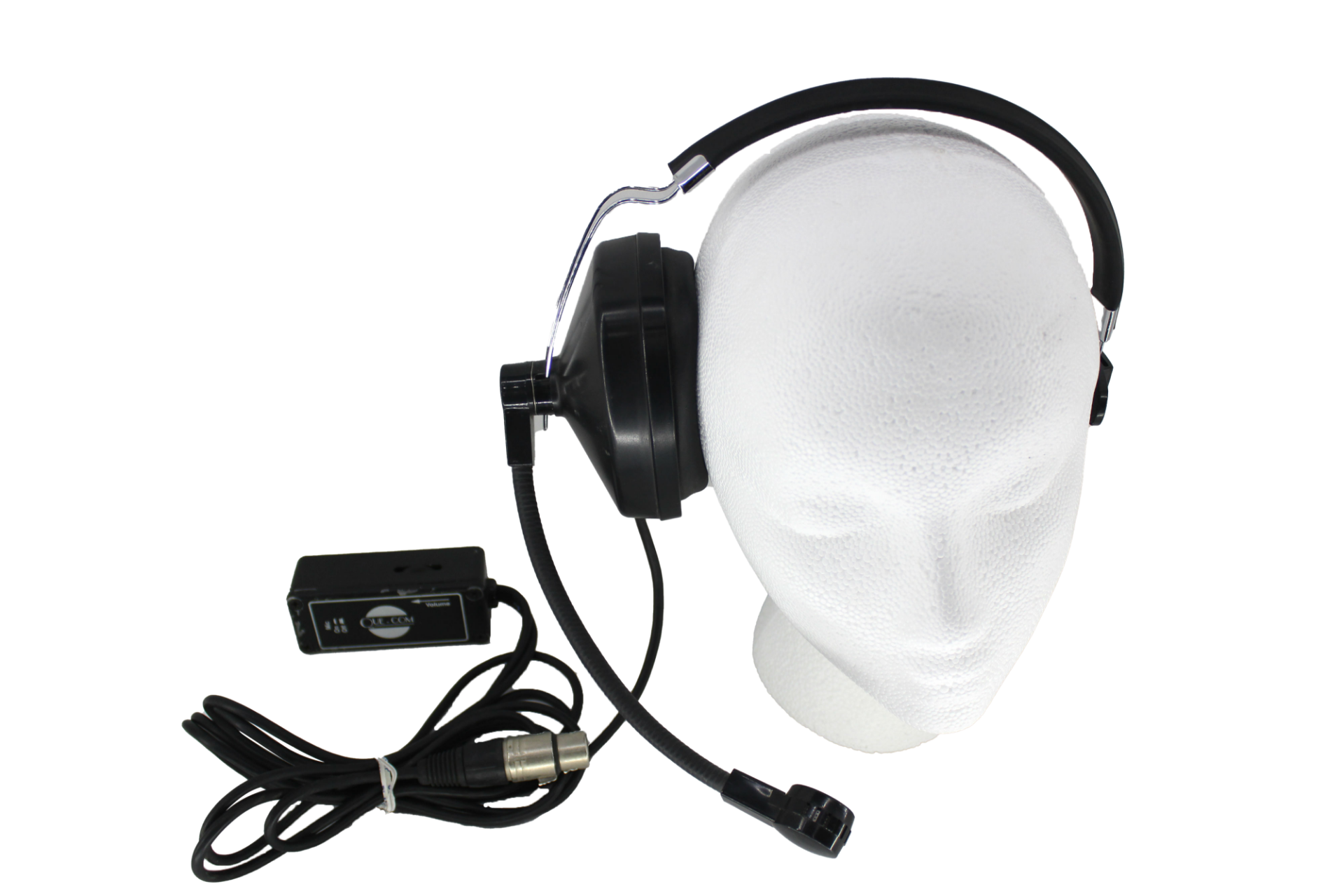 Black and chrome single ear Que-Com headset with extended microphone and attached XLR cable with the control box on a belt clip.