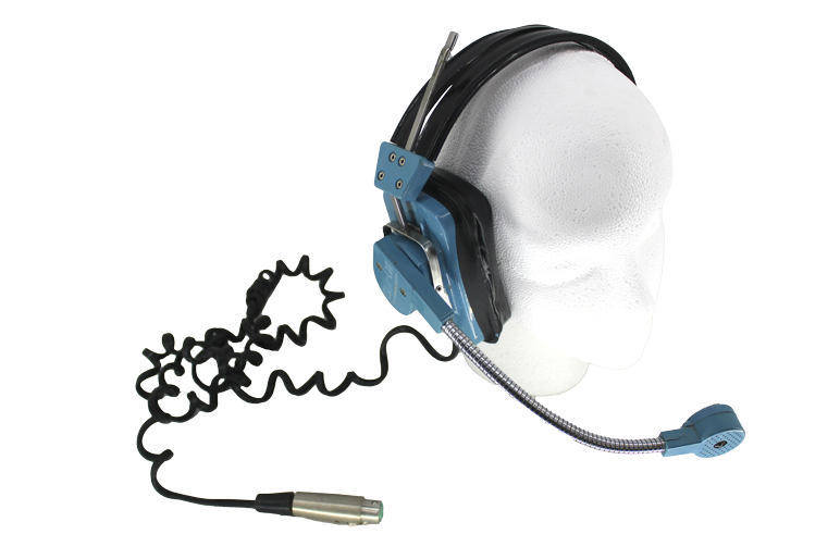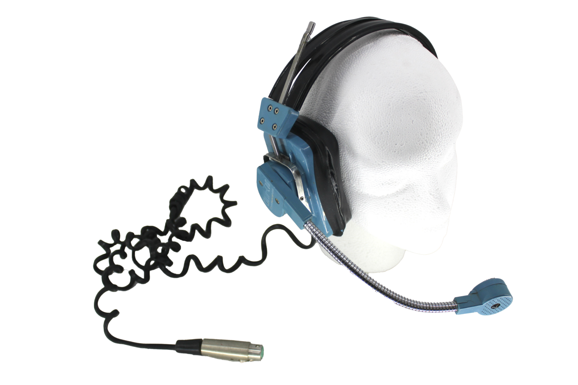 Black, blue, and chrome single ear Clear-Com headset with extended microphone and attached XLR coil cable.