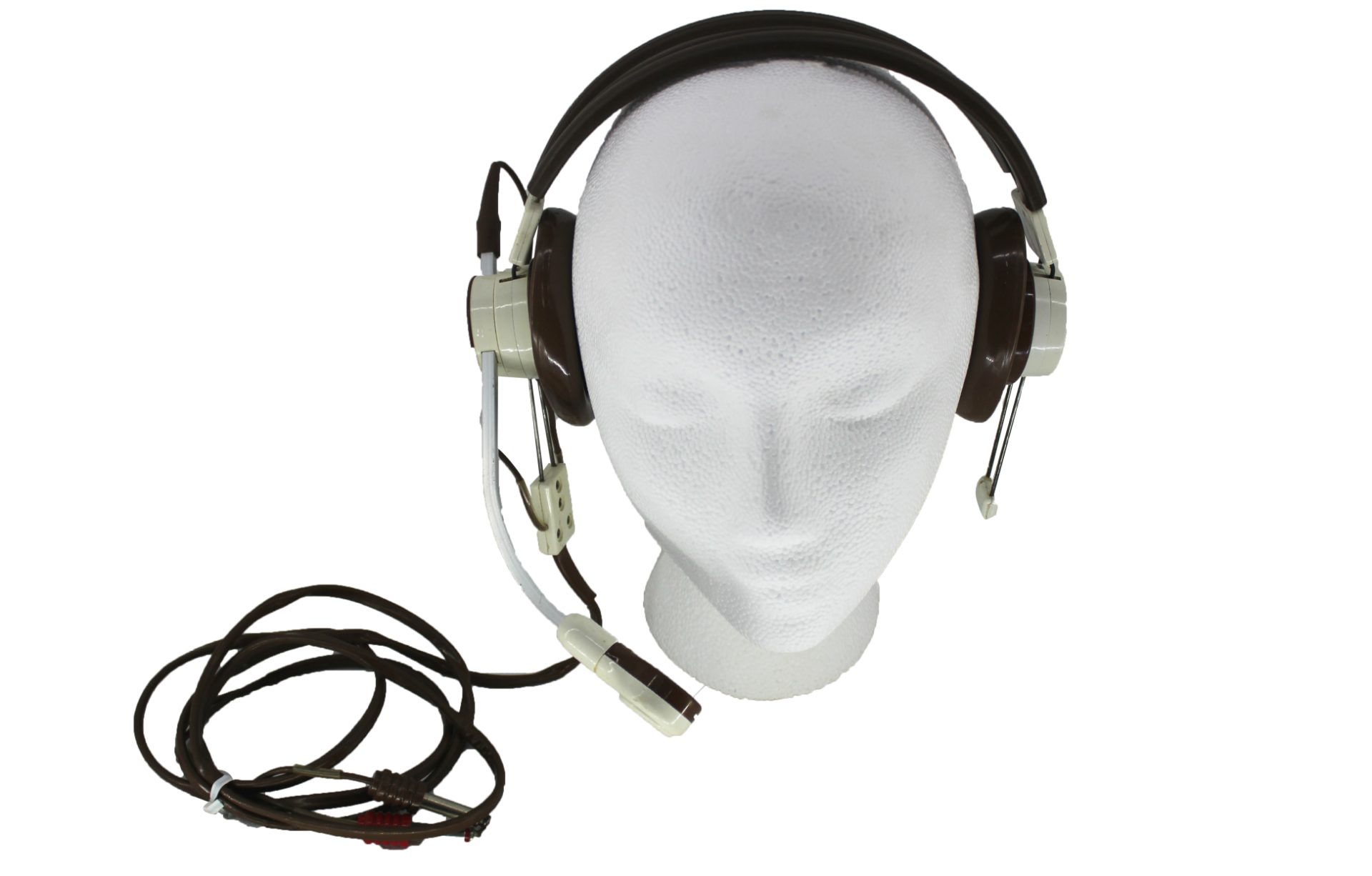 Brown and white, wire frame, Telex 600-10 over-ear headphones with extended microphone and attached dual 1/4" TRS cable.