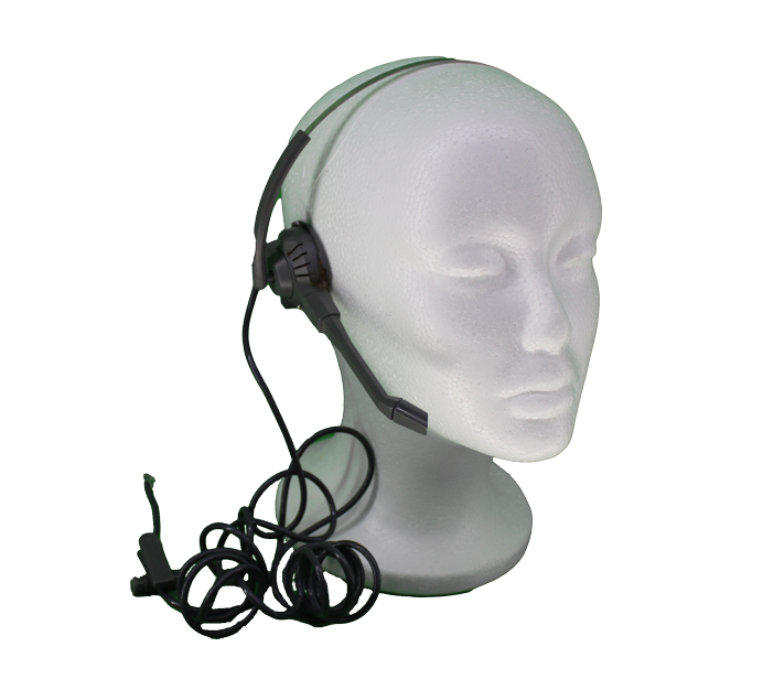 Grey single ear telephone headset with extended microphone and attached telephone line.