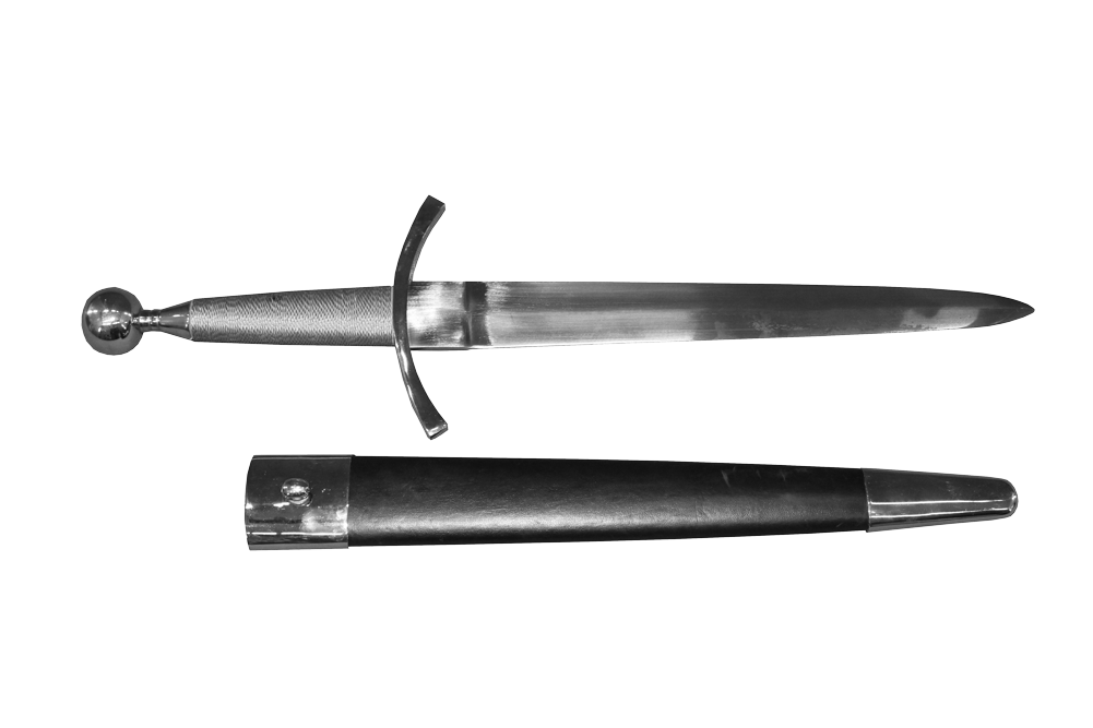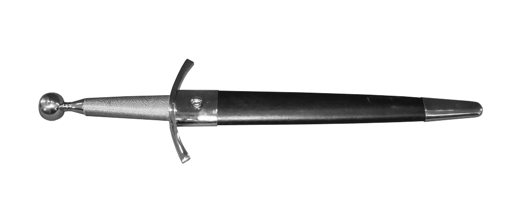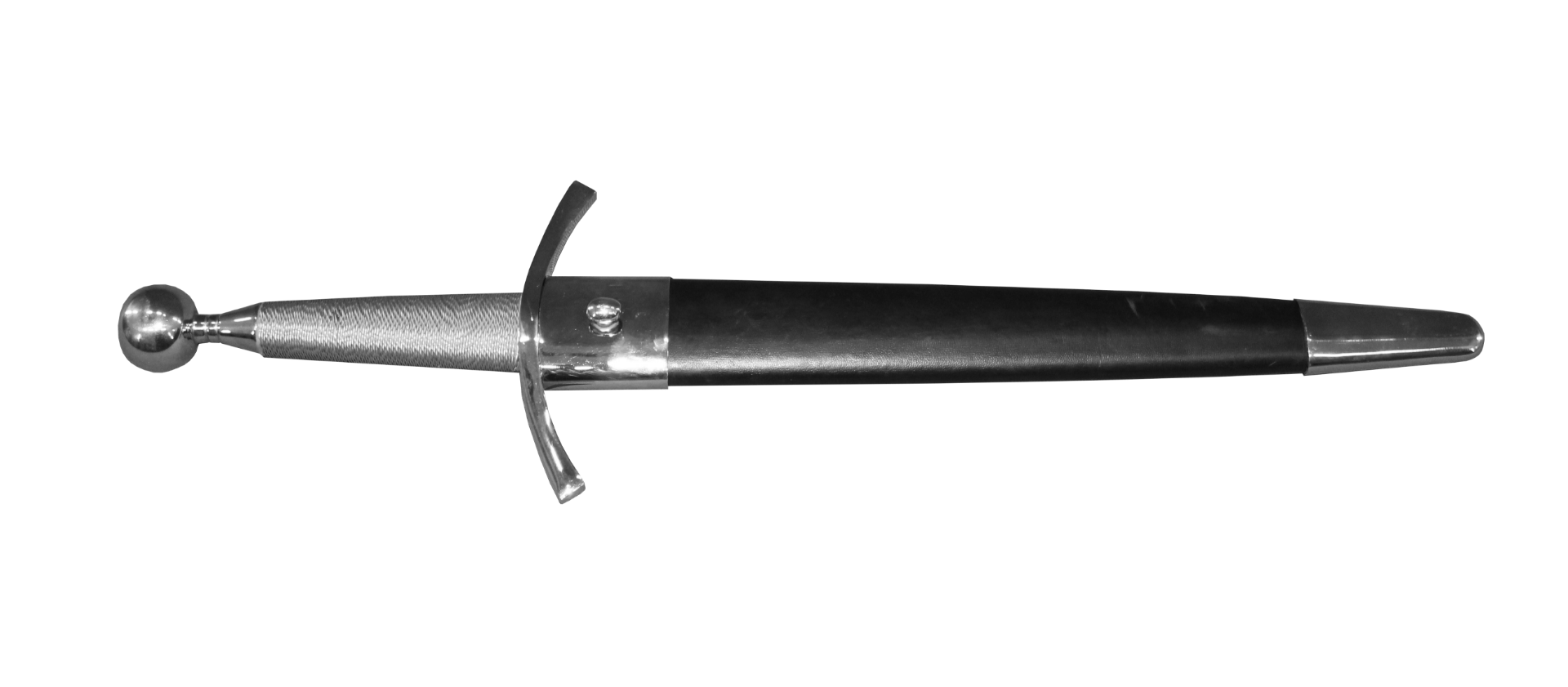 Stainless steel Liege Blade noble dagger with wood/metal scabbard wrapped in black leather.
