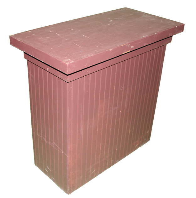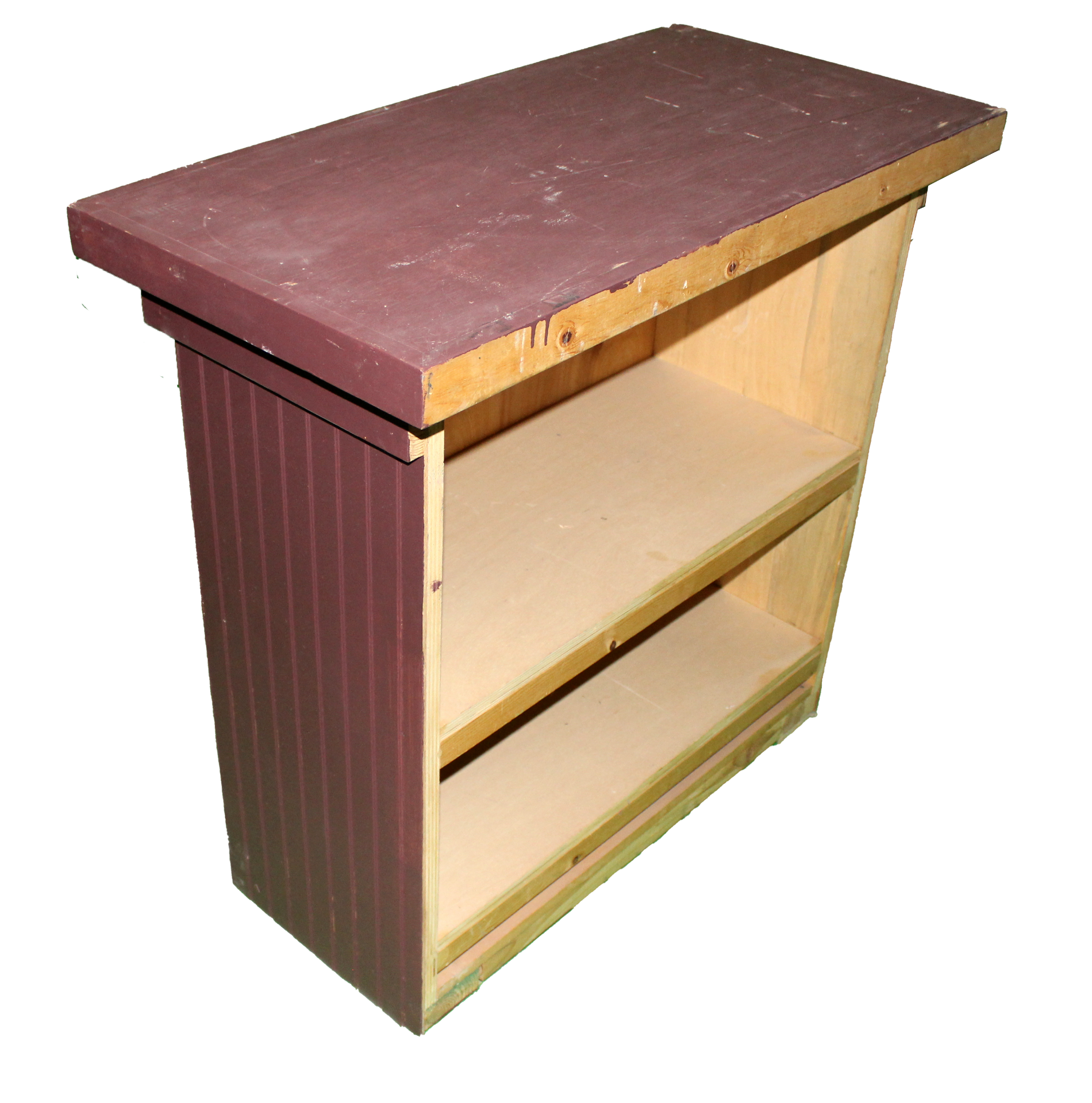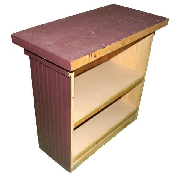 Mauve, painted, wooden bar counter with back shelves and decorative panelling.