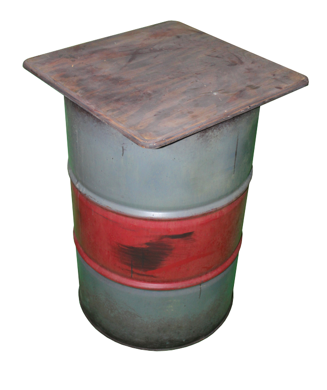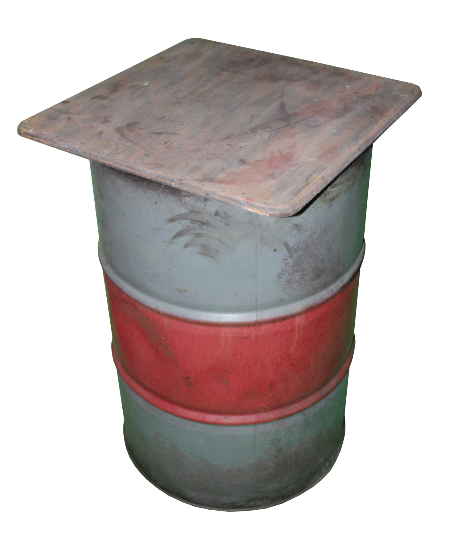 Blue-grey, distressed, metal, rolling, 55 gallon barrel with red, middle stripe and brown, wooden, square top with rounded corners.