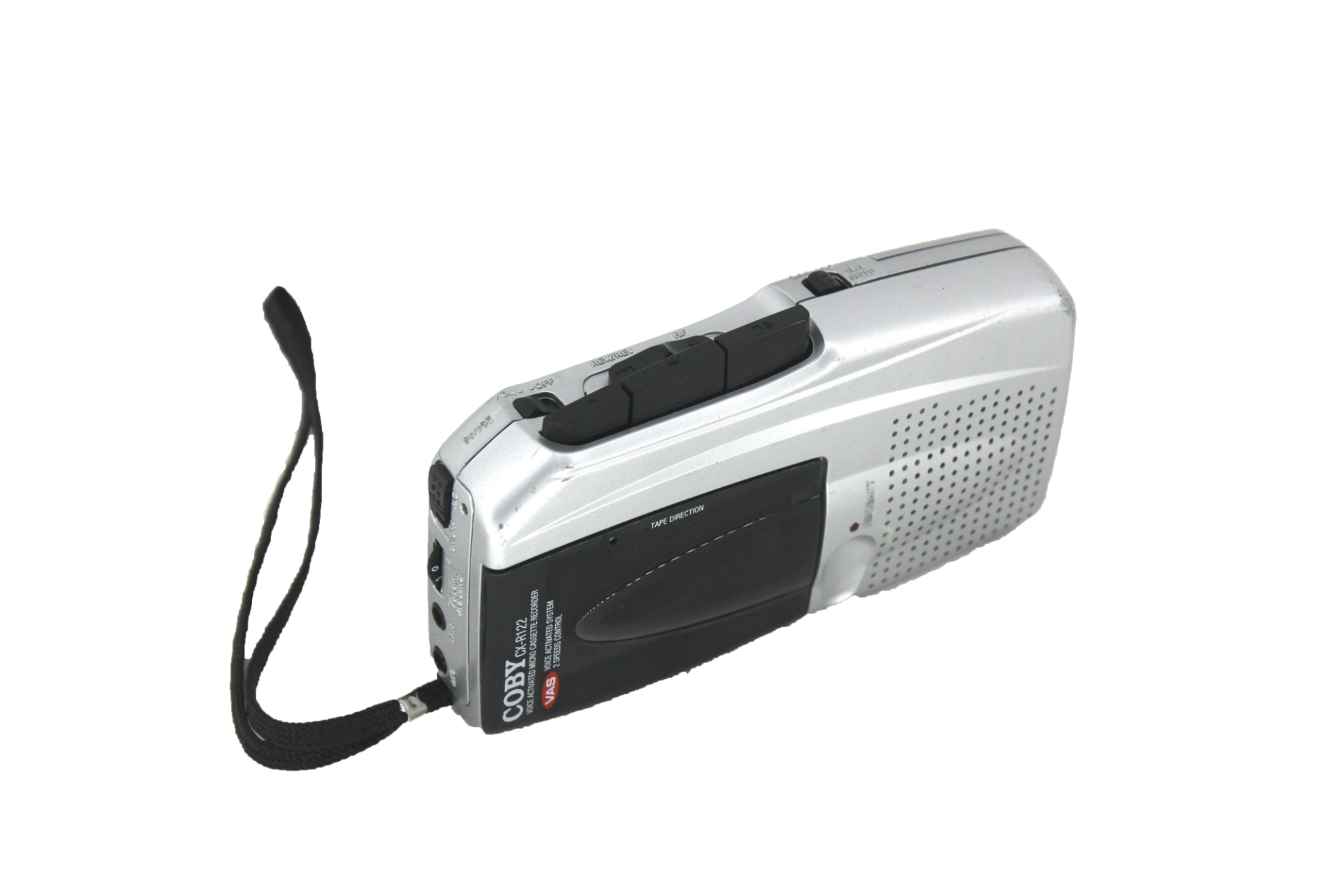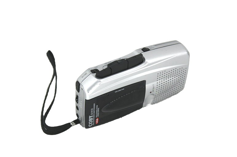 Silver and black Coby CX-R122 handheld microcassette recorder with wrist strap.