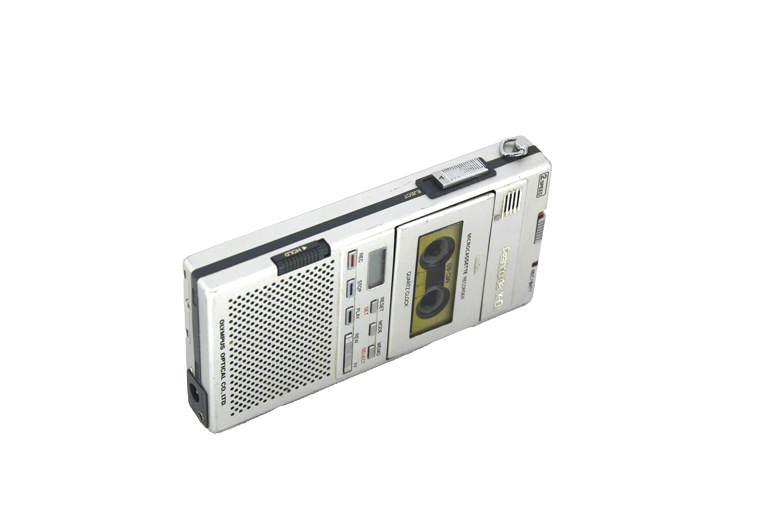 Silver Olympus Pearlcorder X-01 handheld microcassette recorder.