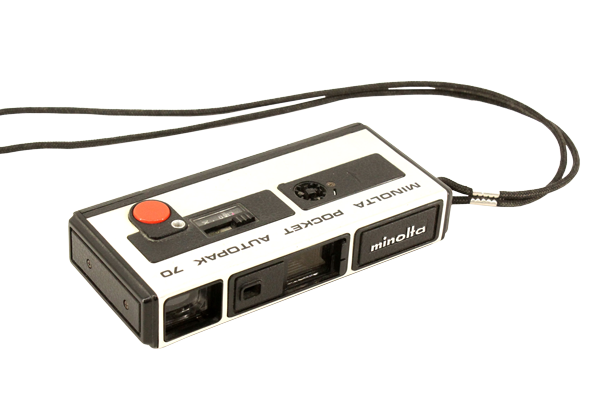 Black and silver Minolta Pocket Autopak 70 camera with neck strap.