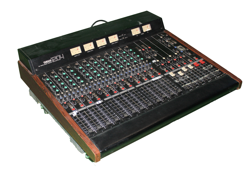 Black Yamaha 1204 MC Series mixing console with brown, wood paneled sides and attached power cord.