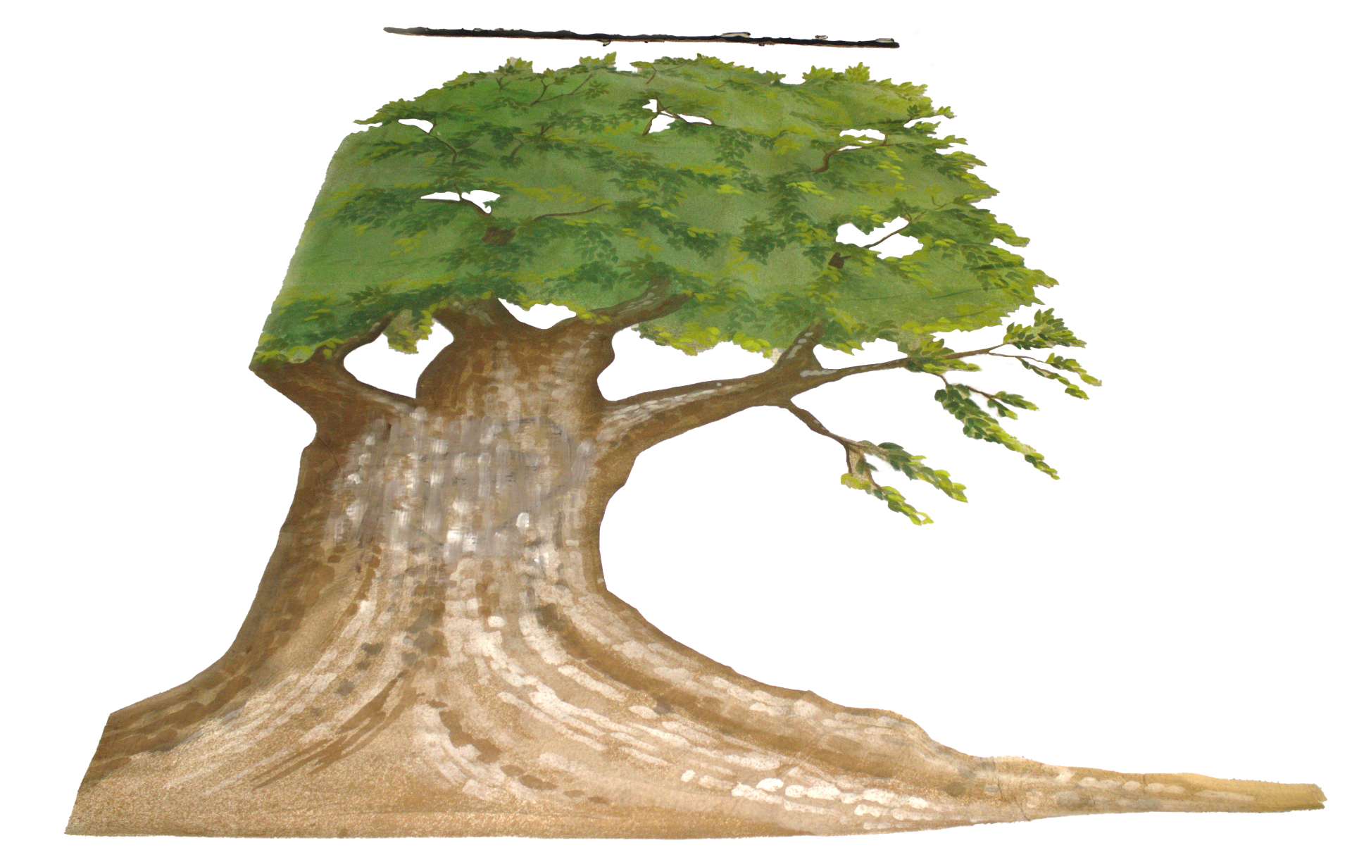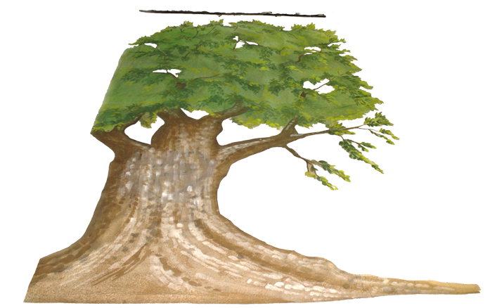 220" x 133" painted muslin tree cutout with plastic netting and jute webbing at the top.