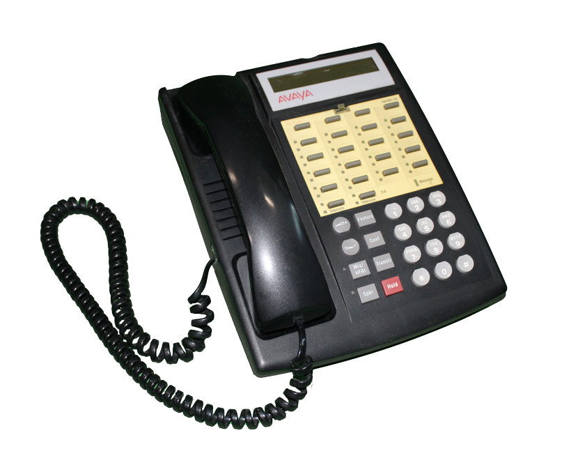 Black Avaya Partner 18D office telephone with wall mount.