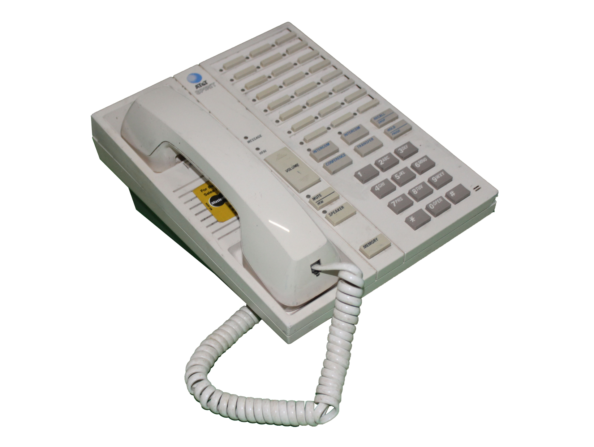 Off white AT&T Spirit office telephone with taupe wall mount.
