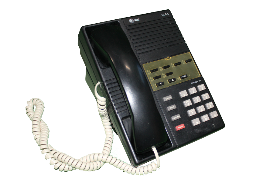 Black AT&T MLS-6 office telephone with wall mount and white cord.