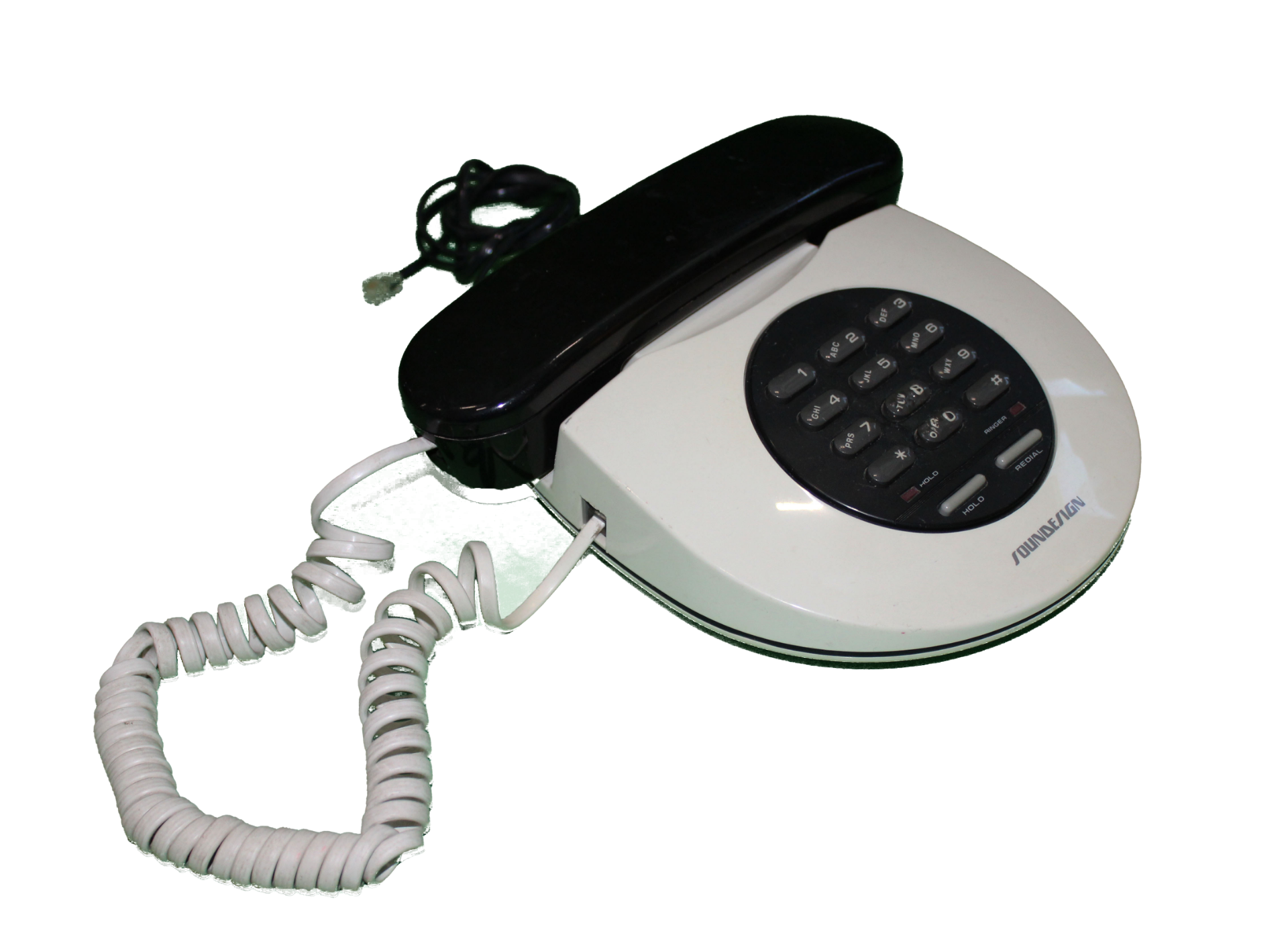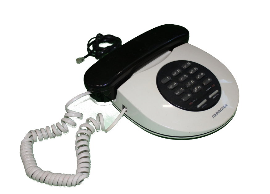 White Soundesign 7229 pancake telephone with black receiver, faceplate and telephone line.