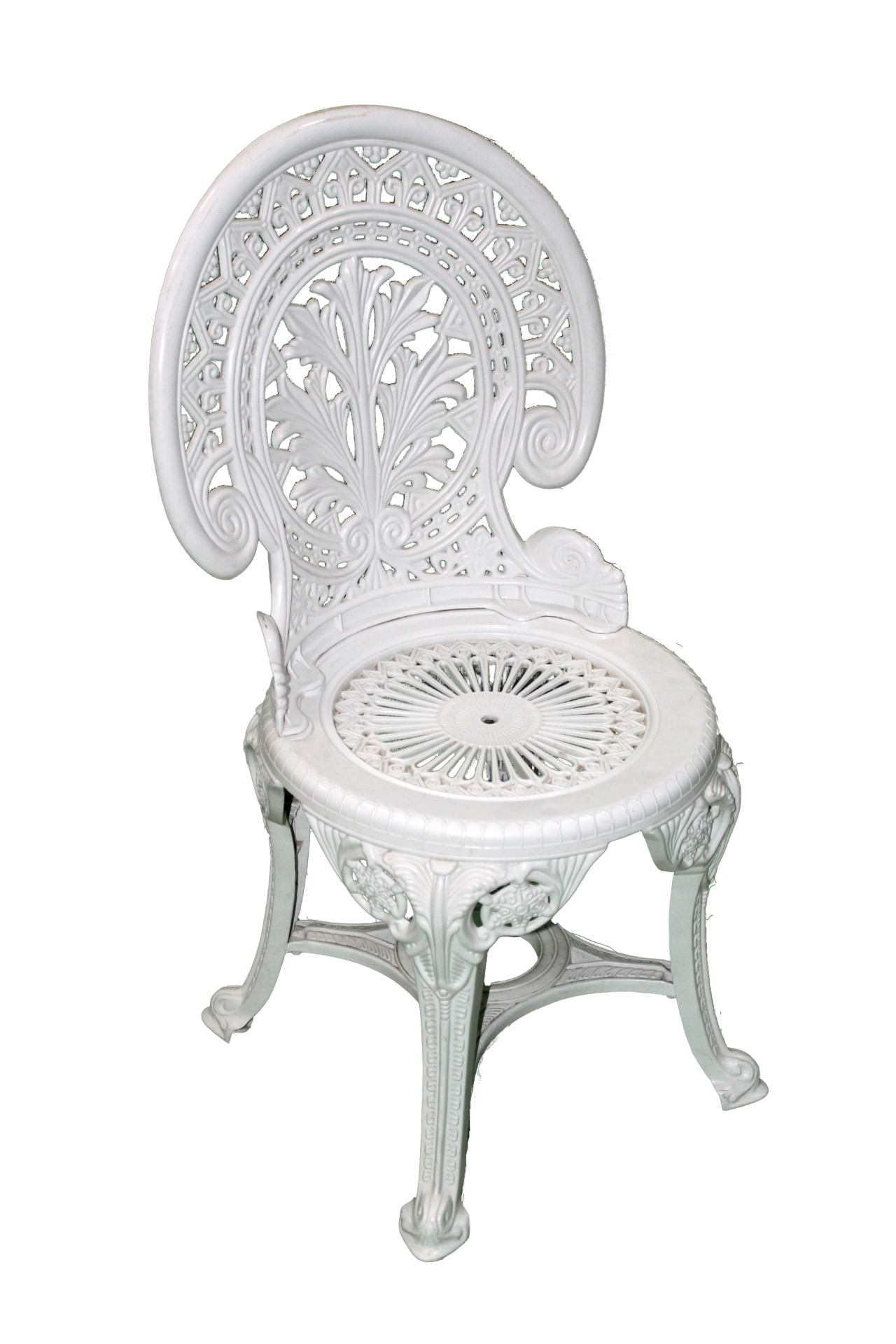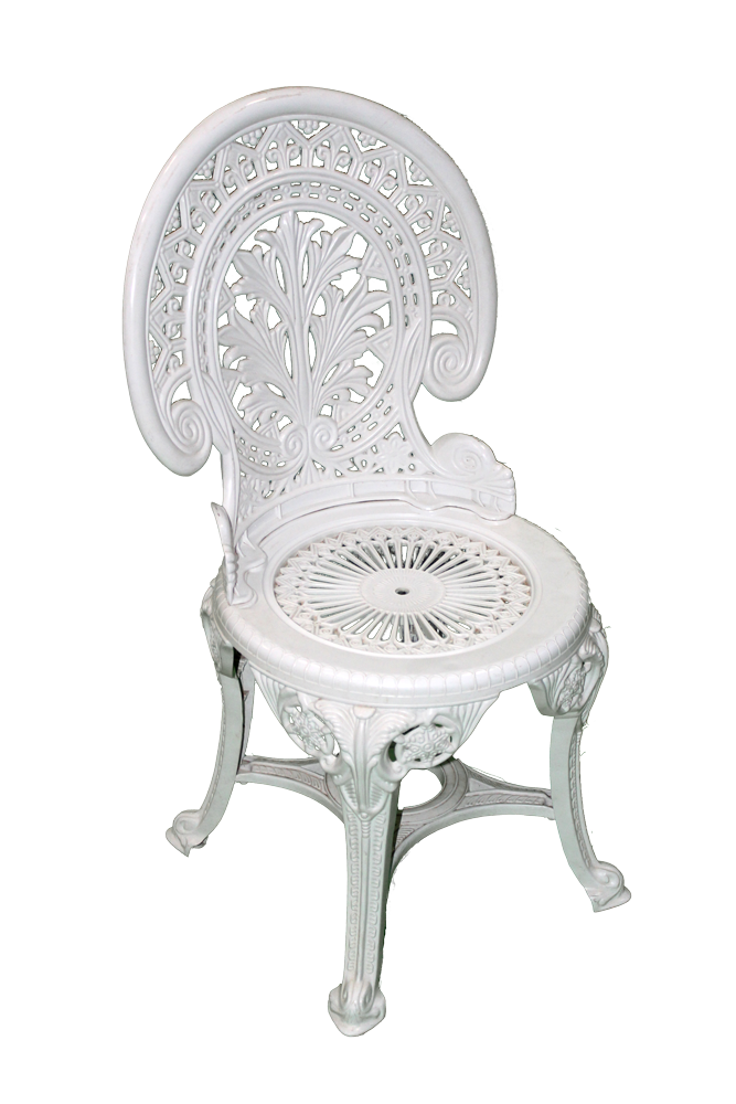 White, plastic patio chair with intricate scrollwork and ornate designs.