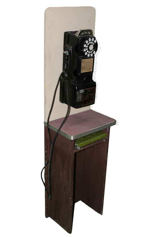 Beige/mauve, wooden payphone stand with black rotary wall payphone and shelf with green telephone directory.