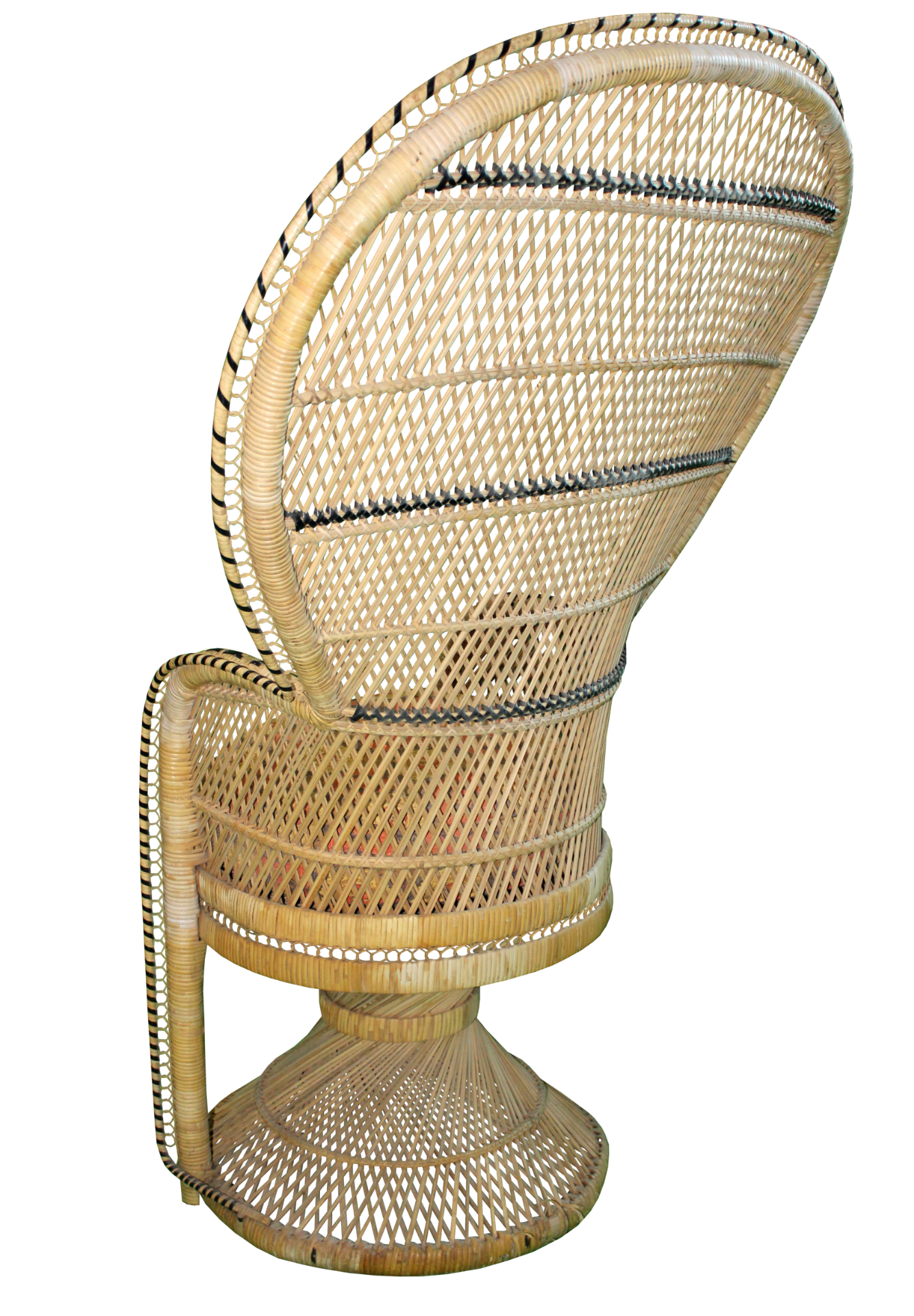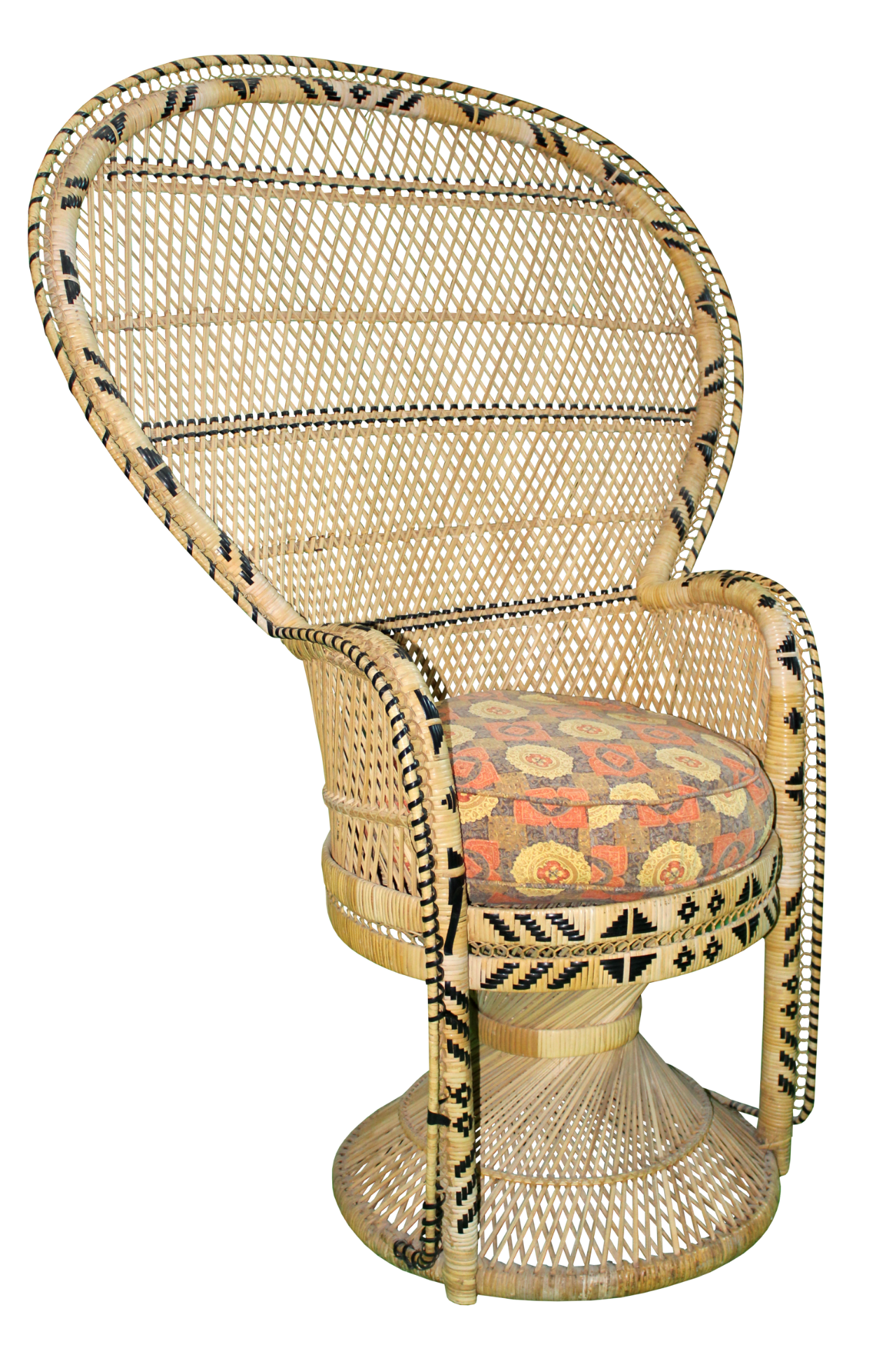 Light brown, wicker peacock chair with black, aztec accents and red/brown/yellow, patterned fabric seat cushion.