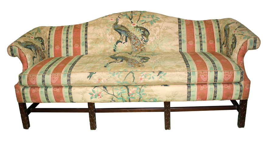 Beige/orange/green sofa with peacock/stripe/floral pattern, curved back and wooden legs.