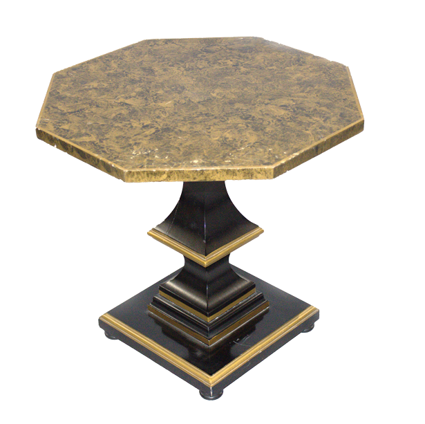 Black and gold, wooden pedestal table with octogonal, faux marble top.