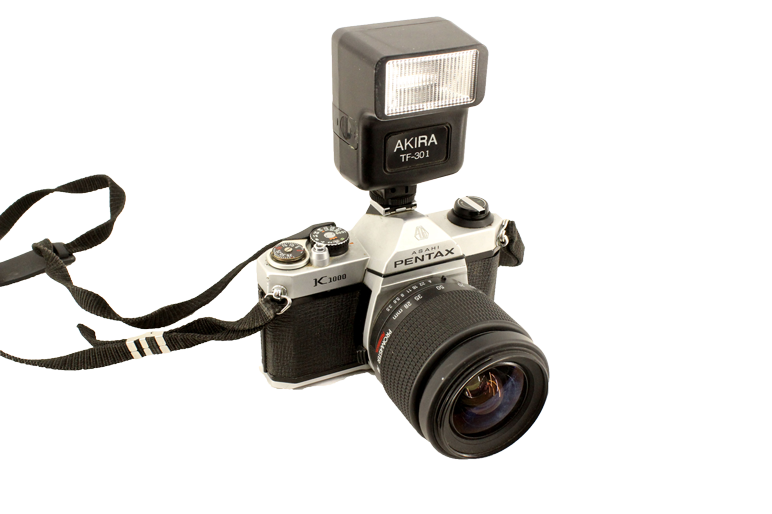 Black and silver Asahi Pentax K1000 35mm SLR camera with 28-80mm Promaster zoom lens, Akira TF-301 flash unit and neck strap.