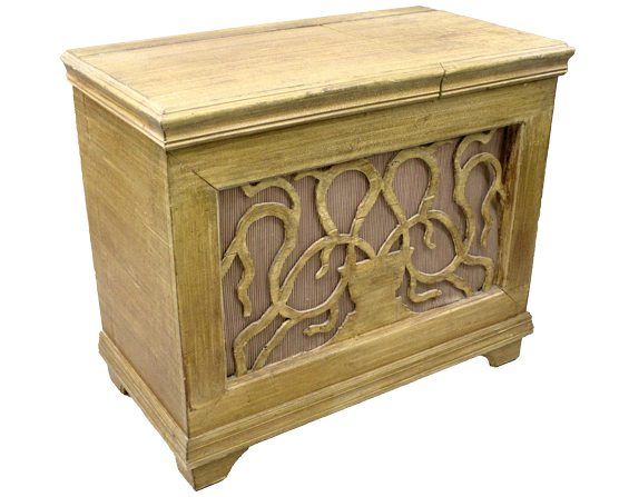 Light brown, wooden phonograph console with two hinged doors on top and decorative swirl design carved out of the front center with red/white striped speaker grill fabric.