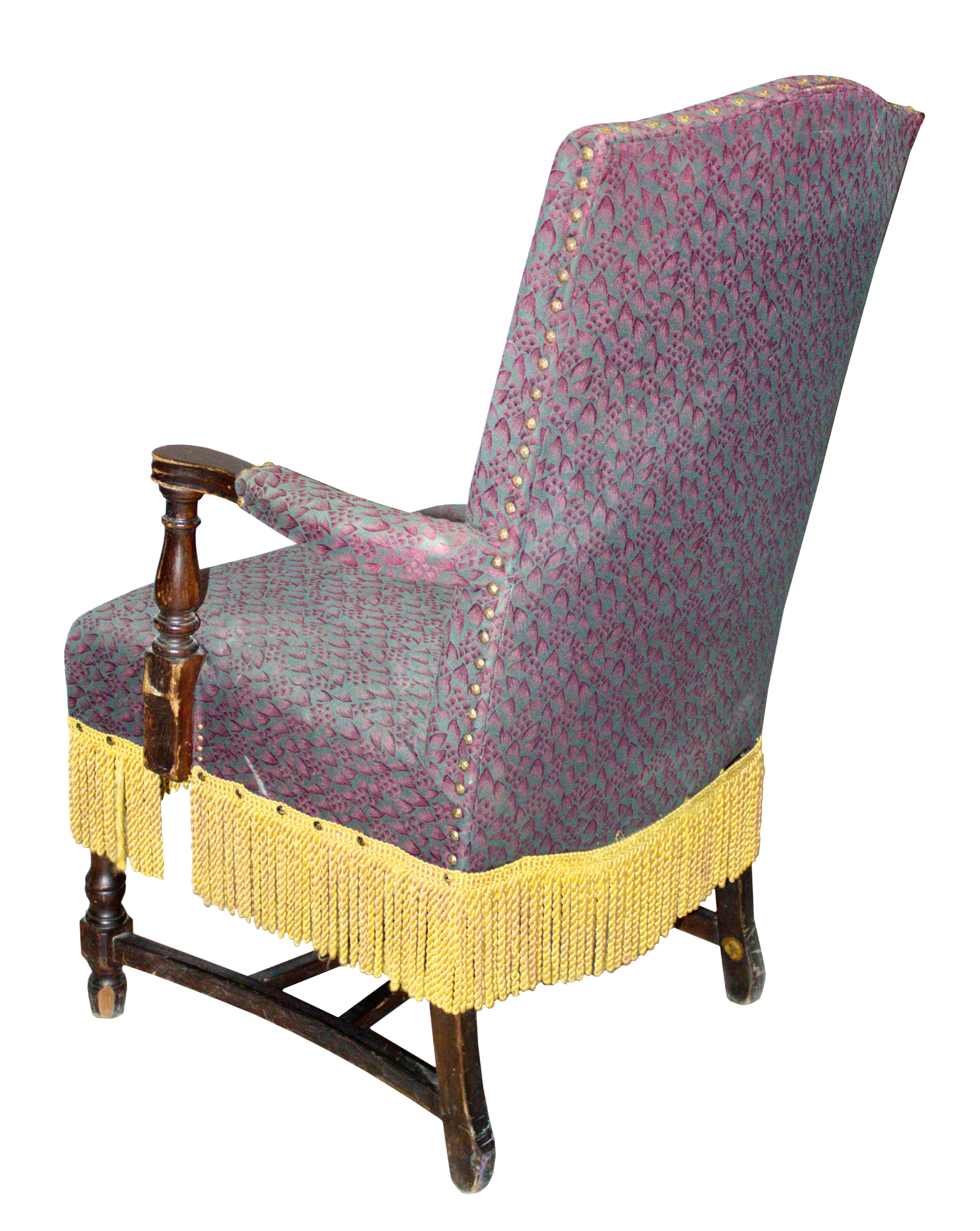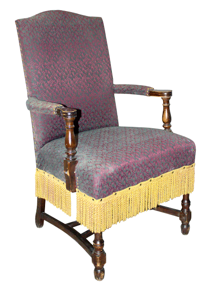 Dark purple/red, iridescent, fabric upholstered armchair with turned legs and arm supports, gold fringe around the seat and nailhead trim.