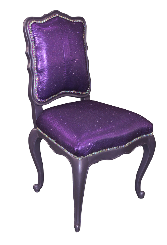 Purple, wooden side chair with purple, sparkle fabric upholstery and crystal, nailhead trim.