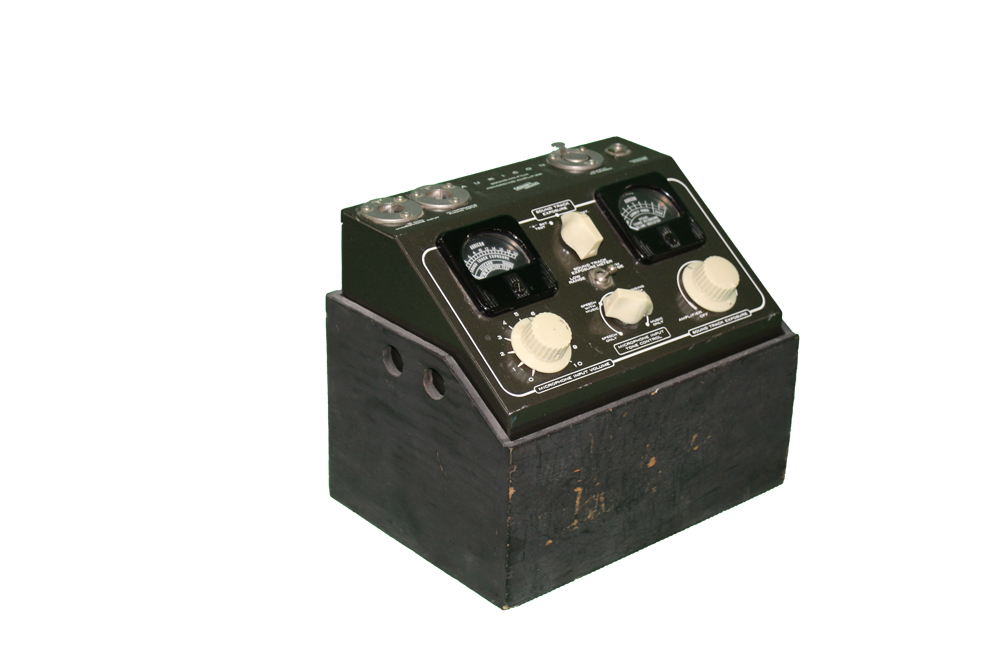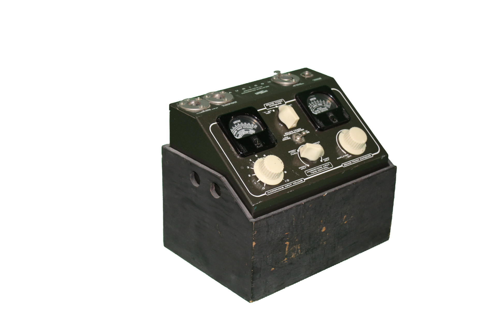 Dark grey, metal Auricon Hollywood sound-on-film recording amplifier with black wooden box holder.