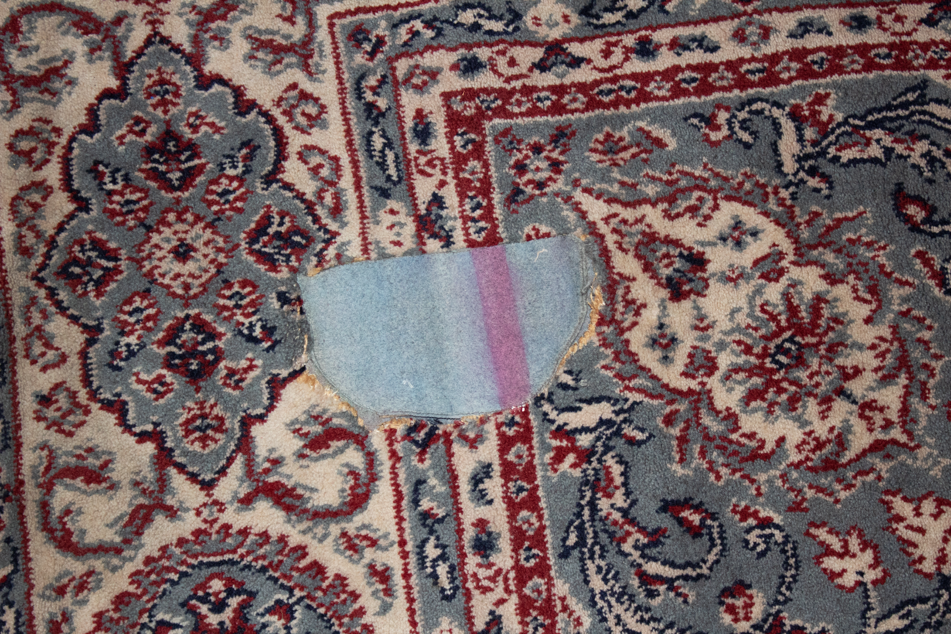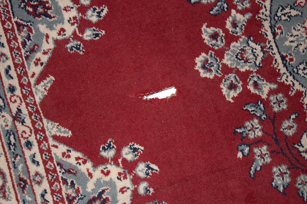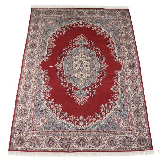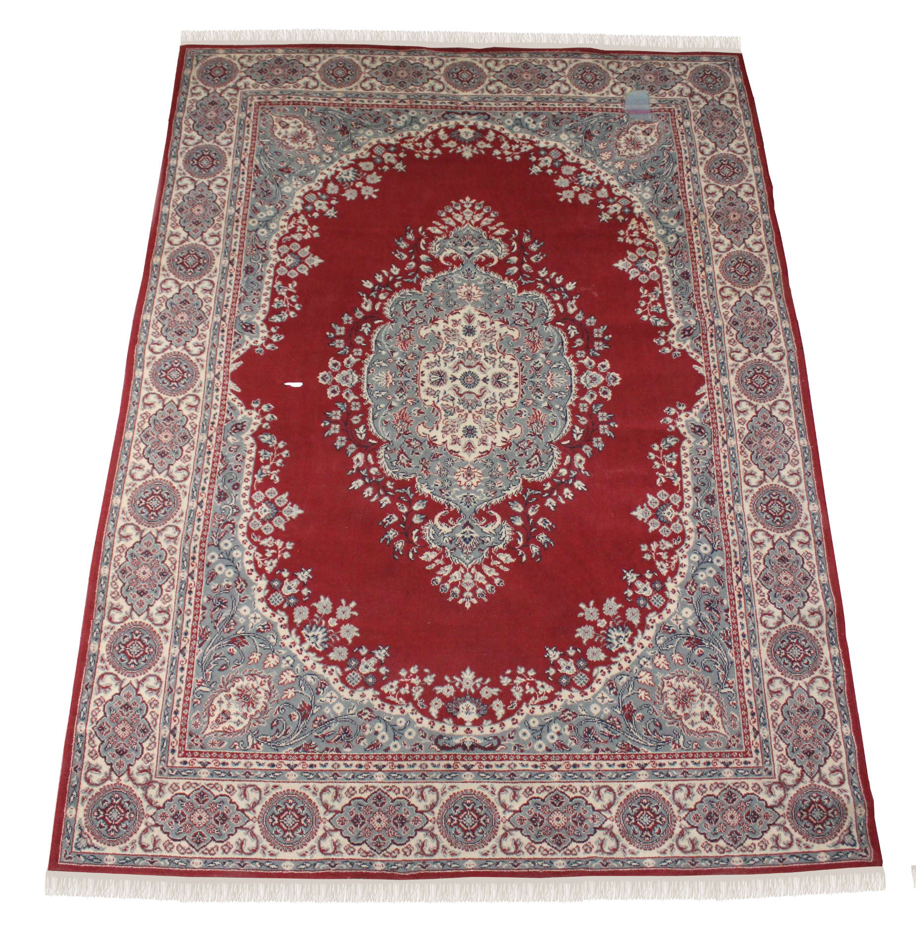 127" x 94" red, rectangular rug with blue/black/ivory oriental pattern and white fringe on the sides.