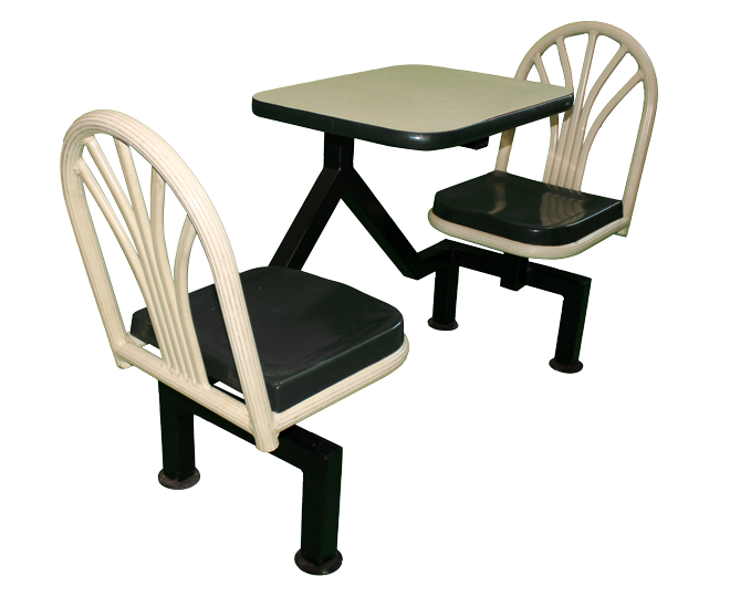 Forest green and beige, metal 2-seat restuarant table with attached swivel chairs and black frame.