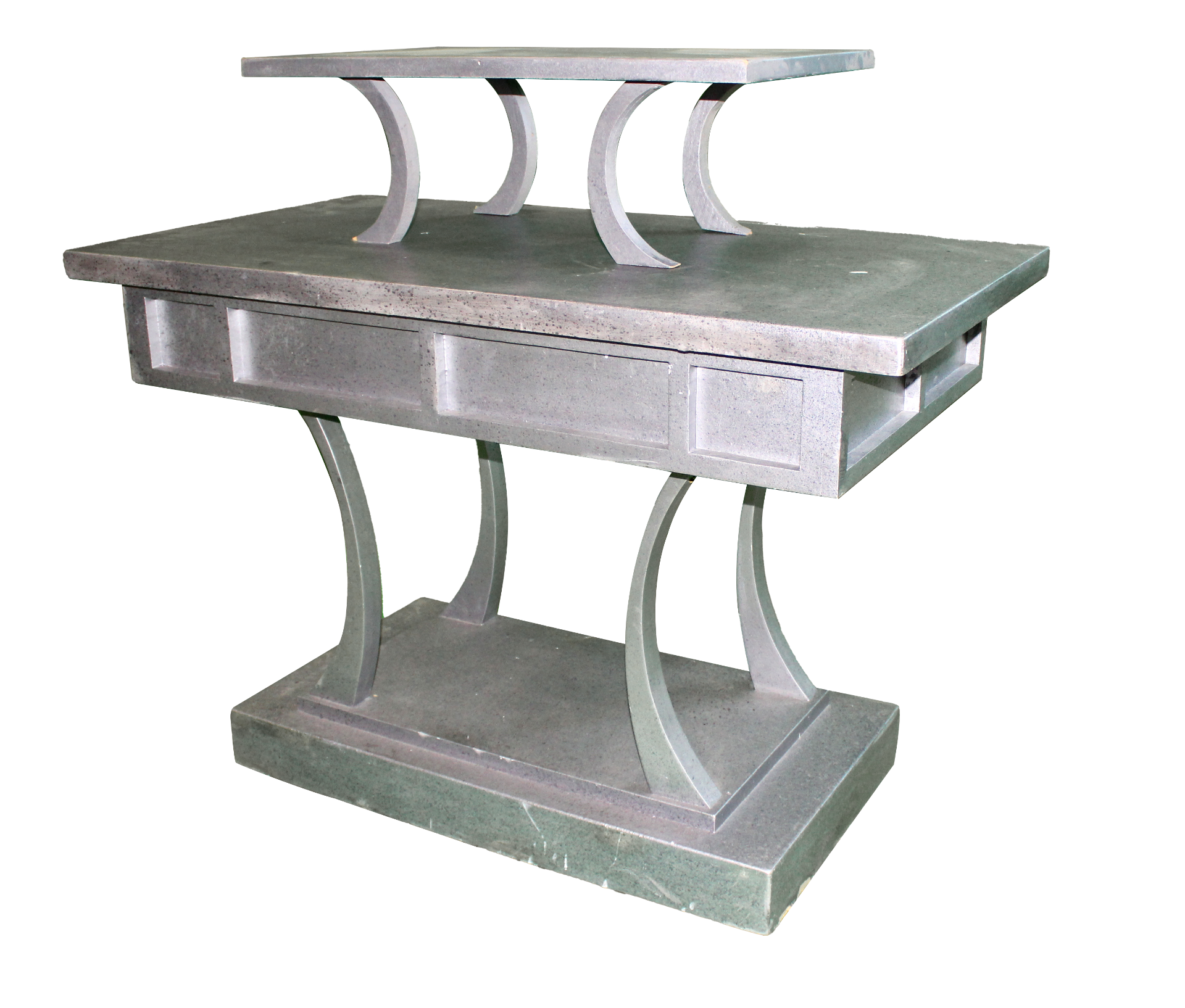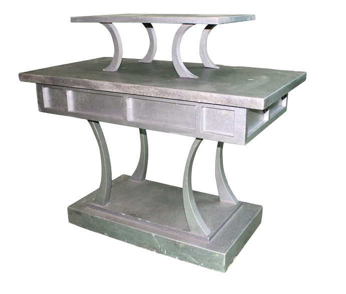 Silver, rectangular, wooden, two-tier rolling table with black speckled paint effect and hanging hooks at the back.