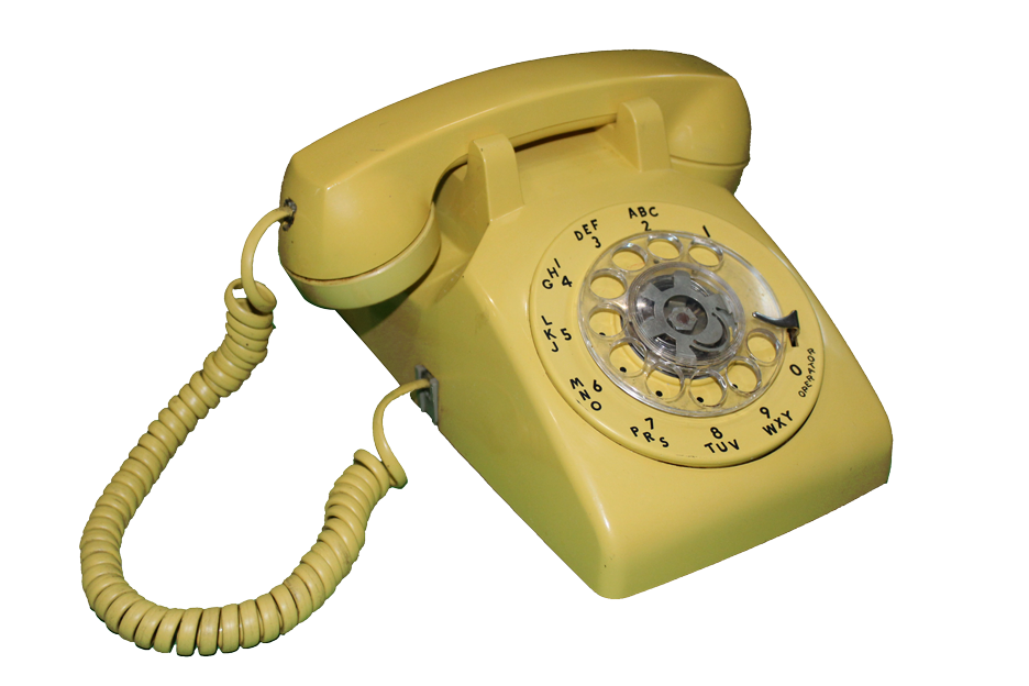 Yellow Western Electric square, rotary desk telephone.