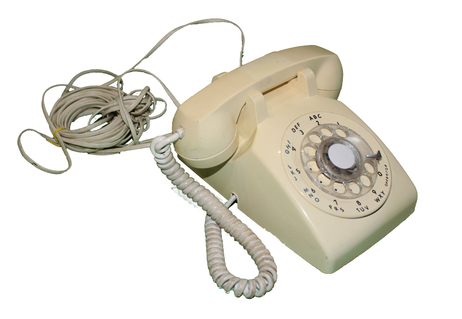 Off white ITT square, rotary desk telephone with attached telephone line.