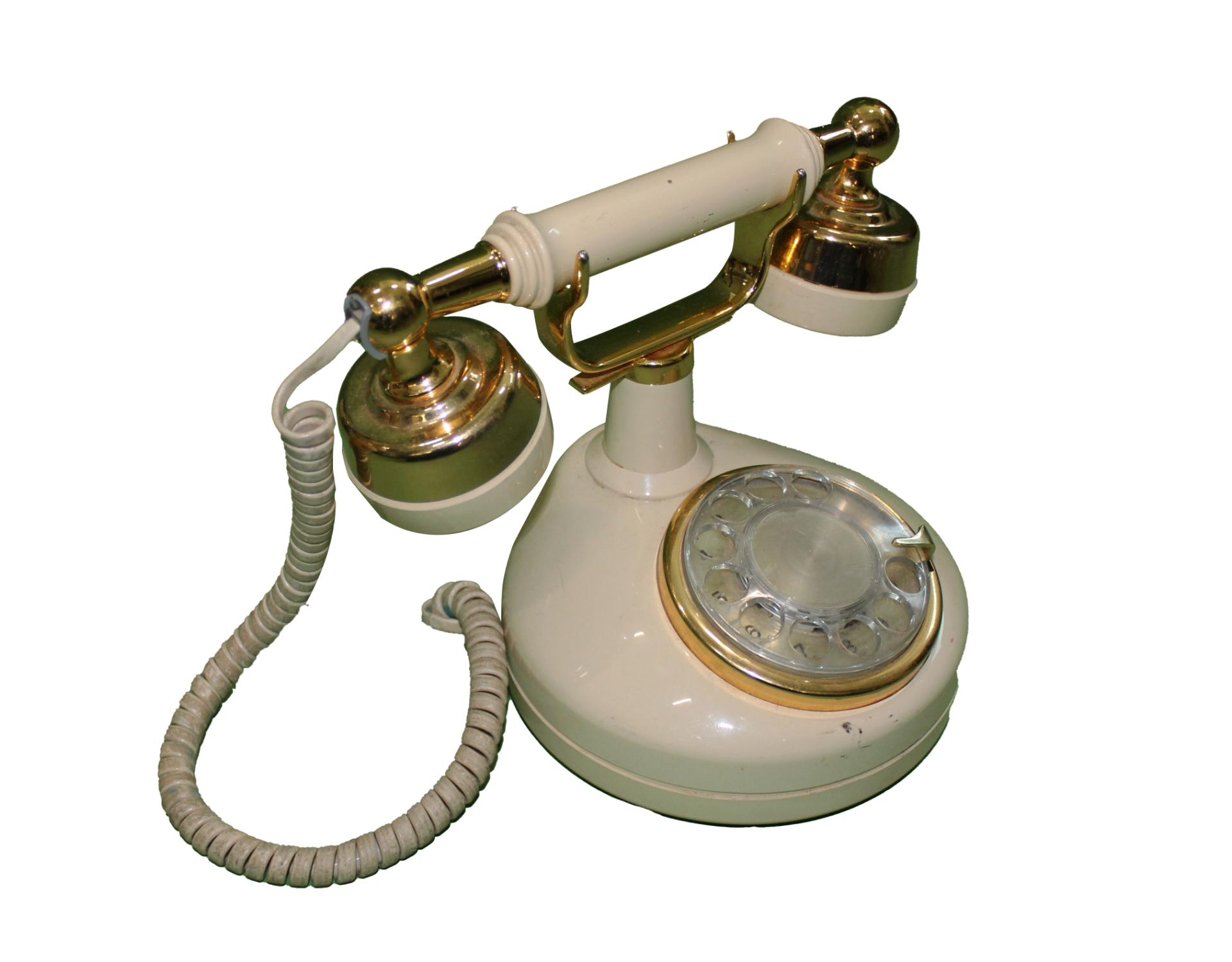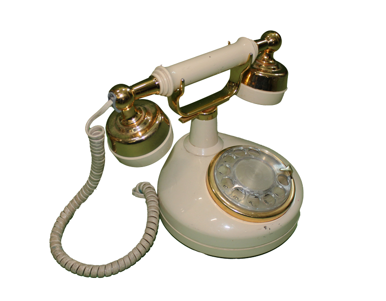 Beige Western Electric rotary desk telephone with circle base and brass trim.